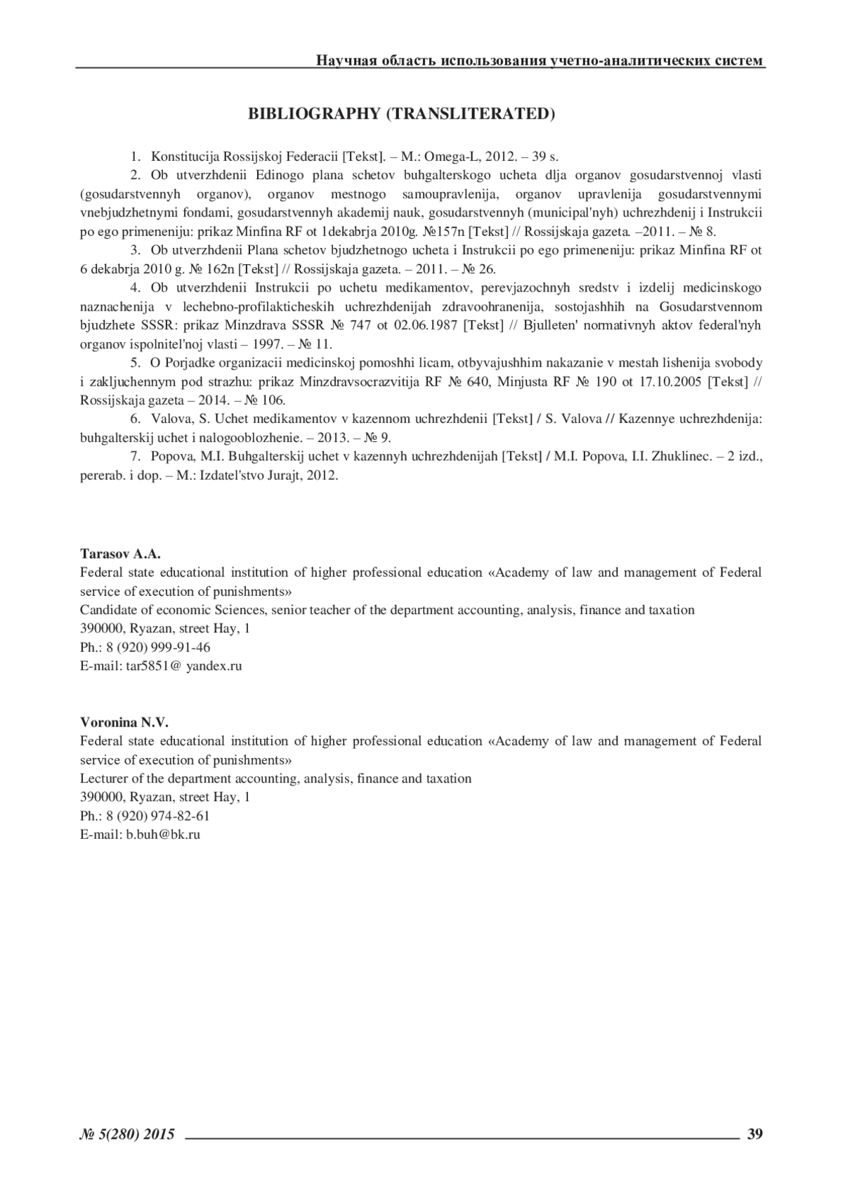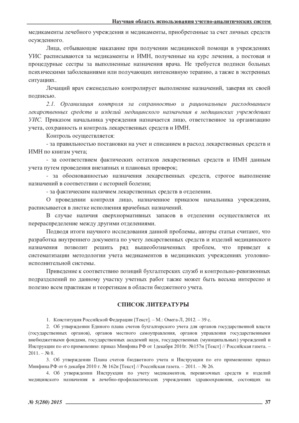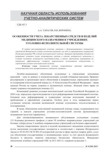 Статья: ОСОБЕННОСТИ УЧЕТА ЛЕКАРСТВЕННЫХ СРЕДСТВ И ИЗДЕЛИЙ МЕДИЦИНСКОГО НАЗНАЧЕНИЯ В УЧРЕЖДЕНИЯХУГОЛОВНО-ИСПОЛНИТЕЛЬНОЙ СИСТЕМЫ (2015)