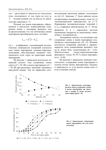 Рассмотрены вопросы влияния давления фонового газа вакуумной камеры на параметры плазменных струй стационарных плазменных двигателей. Приведены результаты обработки экспериментальных данных по ослаблению потока ионов струи за счет процессов резонансной перезарядки на частицах фонового газа, а также по содержанию образующихся при этом ионов перезарядки, применительно к высокоимпульсному двигателю мощностью 2,3 кВт. Измерения параметров струи проводили в диапазоне давления от 1 до 5 мПа (по ксенону). Определено ослабление потока ускоренных ионов струи и содержание ионов перезарядки. Получены угловые характеристики ионов струи при различных значениях давления. Показано, что давление в вакуумной камере оказывает значительное влияние не только на распространение струи, но и на процессы формирования струи в самом двигателе.