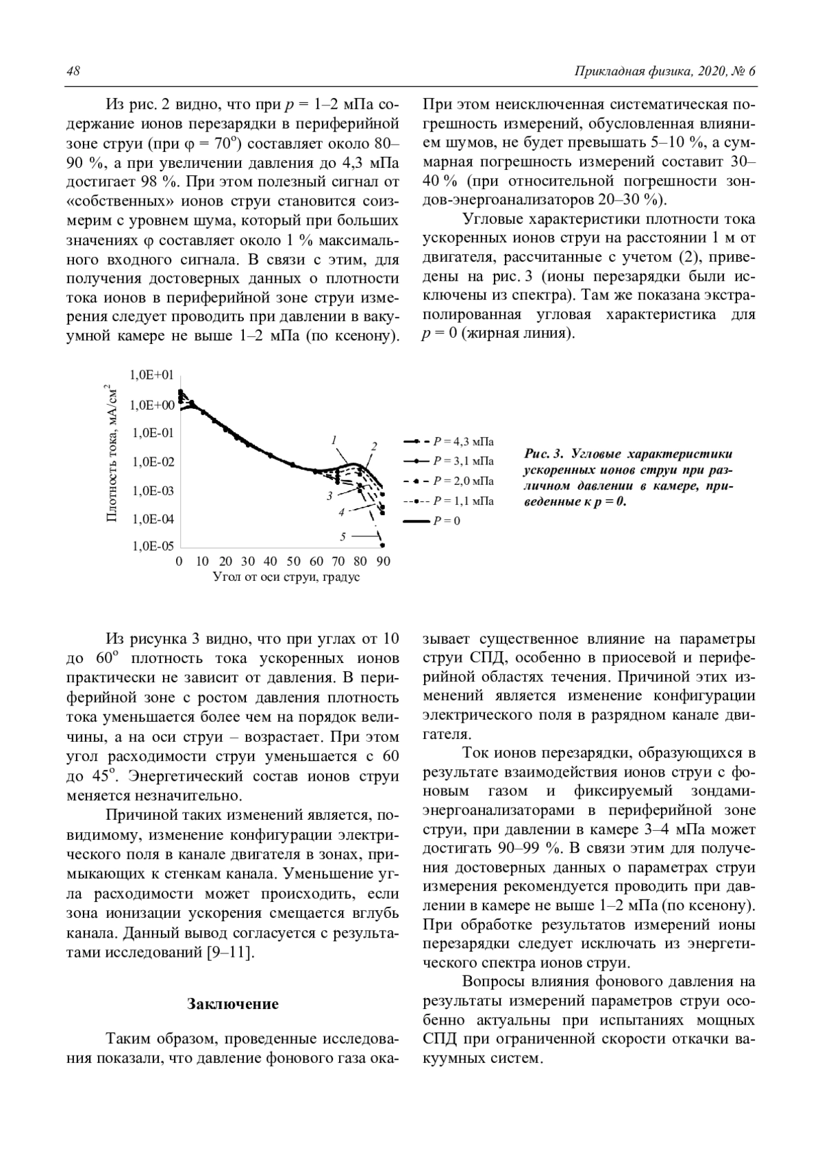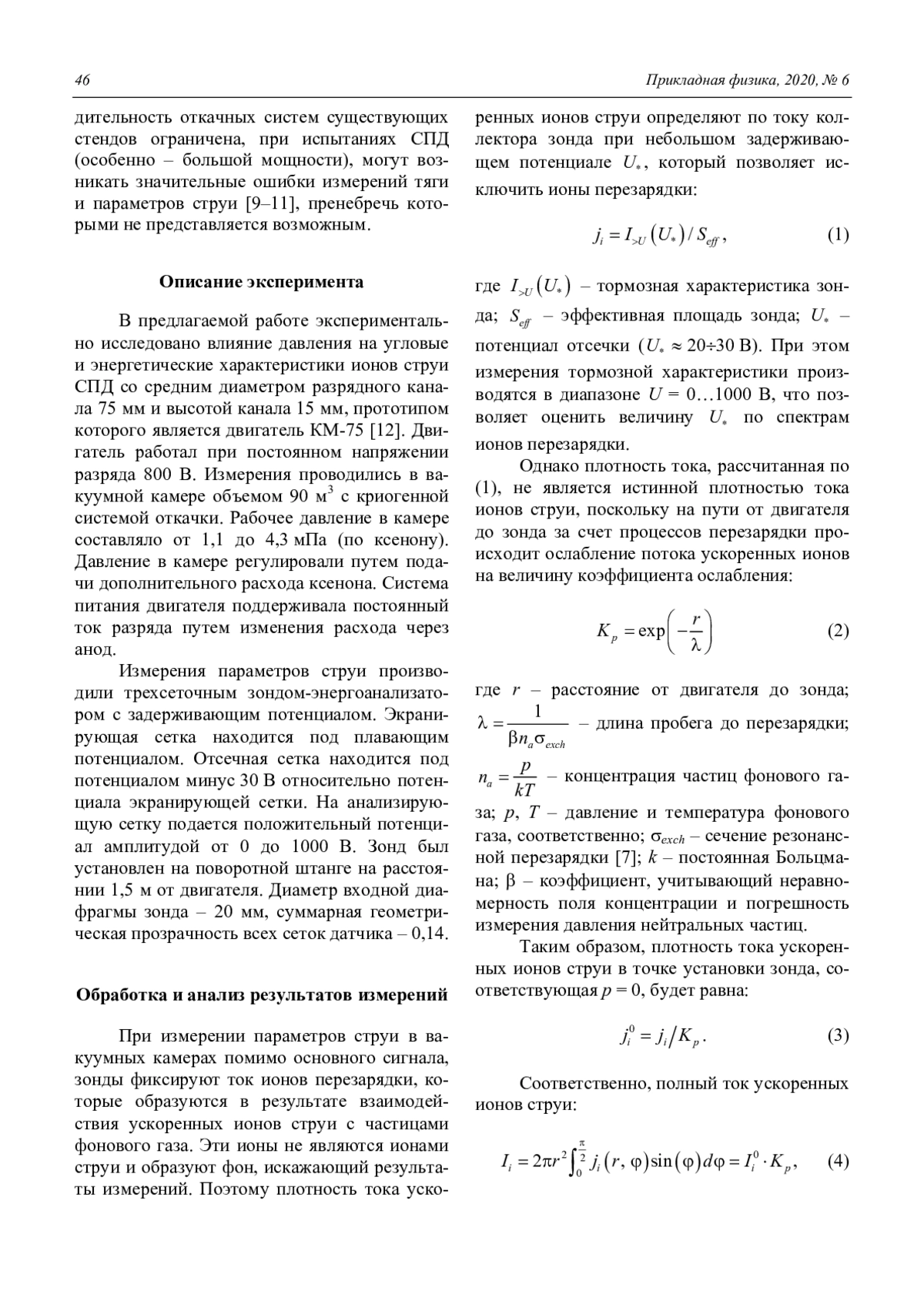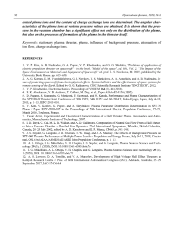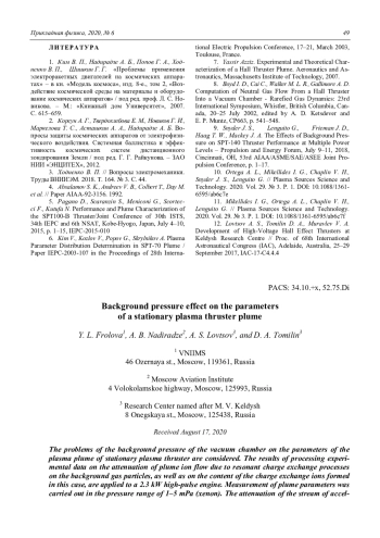 ФРОЛОВА Ю. Л., НАДИРАДЗЕ А. Б., ЛОВЦОВ А. С., ТОМИЛИН Д. А. ВЛИЯНИЕ ДАВЛЕНИЯ ФОНОВОГО ГАЗА НА ПАРАМЕТРЫ СТРУИ СТАЦИОНАРНОГО ПЛАЗМЕННОГО ДВИГАТЕЛЯ // ПРИКЛАДНАЯ ФИЗИКА. 2020. №6