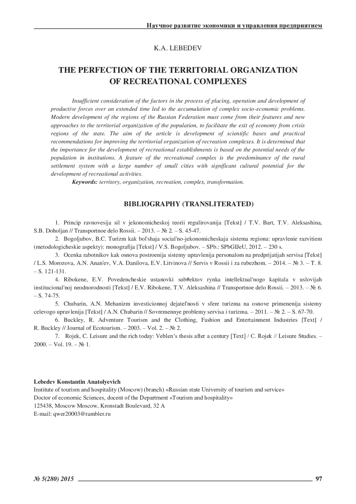 ЛЕБЕДЕВ К. А. СОВЕРШЕНСТВОВАНИЕ ТЕРРИТОРИАЛЬНОЙ ОРГАНИЗАЦИИ РЕКРЕАЦИОННЫХ КОМПЛЕКСОВ // ЭКОНОМИЧЕСКИЕ И ГУМАНИТАРНЫЕ НАУКИ. 2015. № 5 (280)
