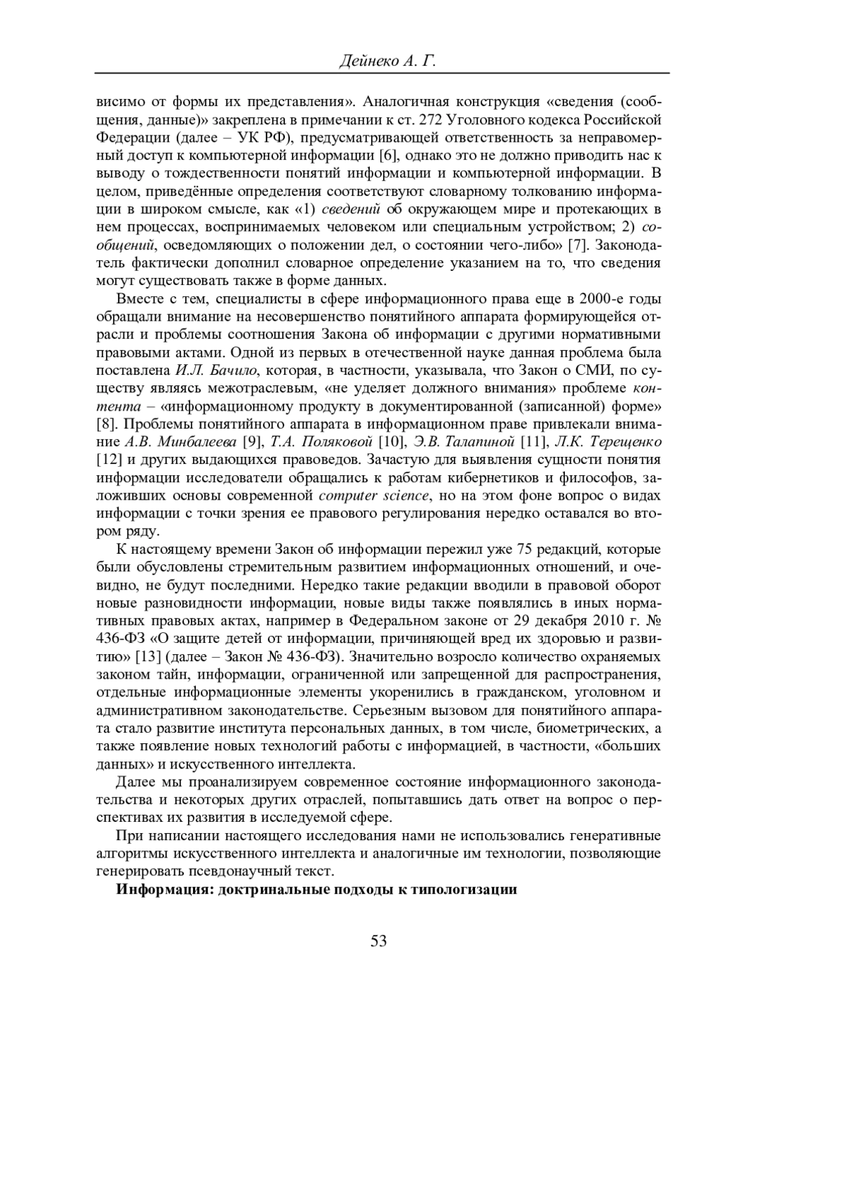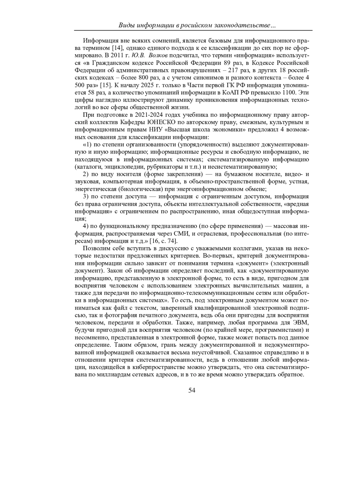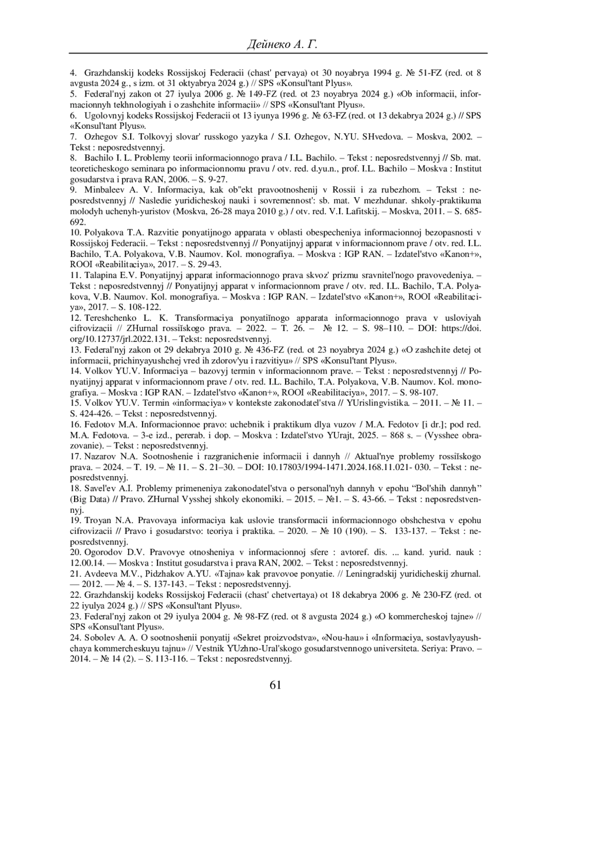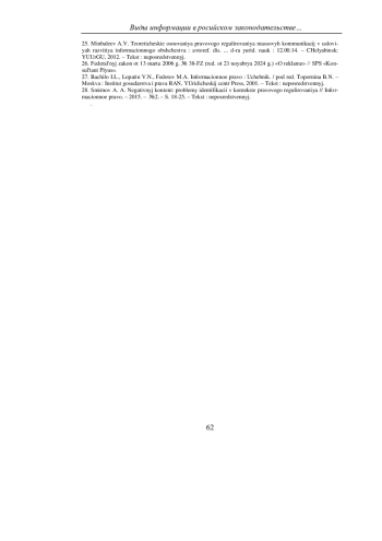 ДЕЙНЕКО А. Г. ВИДЫ ИНФОРМАЦИИ В РОССИЙСКОМ ЗАКОНОДАТЕЛЬСТВЕ: СОВРЕМЕННОЕ СОСТОЯНИЕ И ПЕРСПЕКТИВЫ СИСТЕМАТИЗАЦИИ // УЧЕНЫЕ ЗАПИСКИ КРЫМСКОГО ФЕДЕРАЛЬНОГО УНИВЕРСИТЕТА ИМЕНИ В. И. ВЕРНАДСКОГО. ЮРИДИЧЕСКИЕ НАУКИ. 2025. ТОМ 11(77). №1