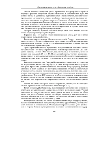 Политика является важной составляющей развития государства. Безусловно, Д. И. Менделеев, будучи государственным мыслителем, не мог пройти мимо проблем российского государства в данном направлении. Он был сторонником идеи миролюбивой политики на мировой арене. Многие мысли, поднятые им в его времена, находят свое отражение и в нынешних реалиях. Идеи Менделеева и сегодня вдохновляют на поиск новых решений в области права и государственного управления, подчеркивая необходимость продолжения интеграции научных достижений в правовую систему для обеспечения устойчивого развития общества и государства. Его предложения и взгляды служат основой для дальнейших исследований и разработок в области права, экономики и управления, подчеркивая важность научного подхода в решении социальных и экономических задач на государственном и международном уровнях.