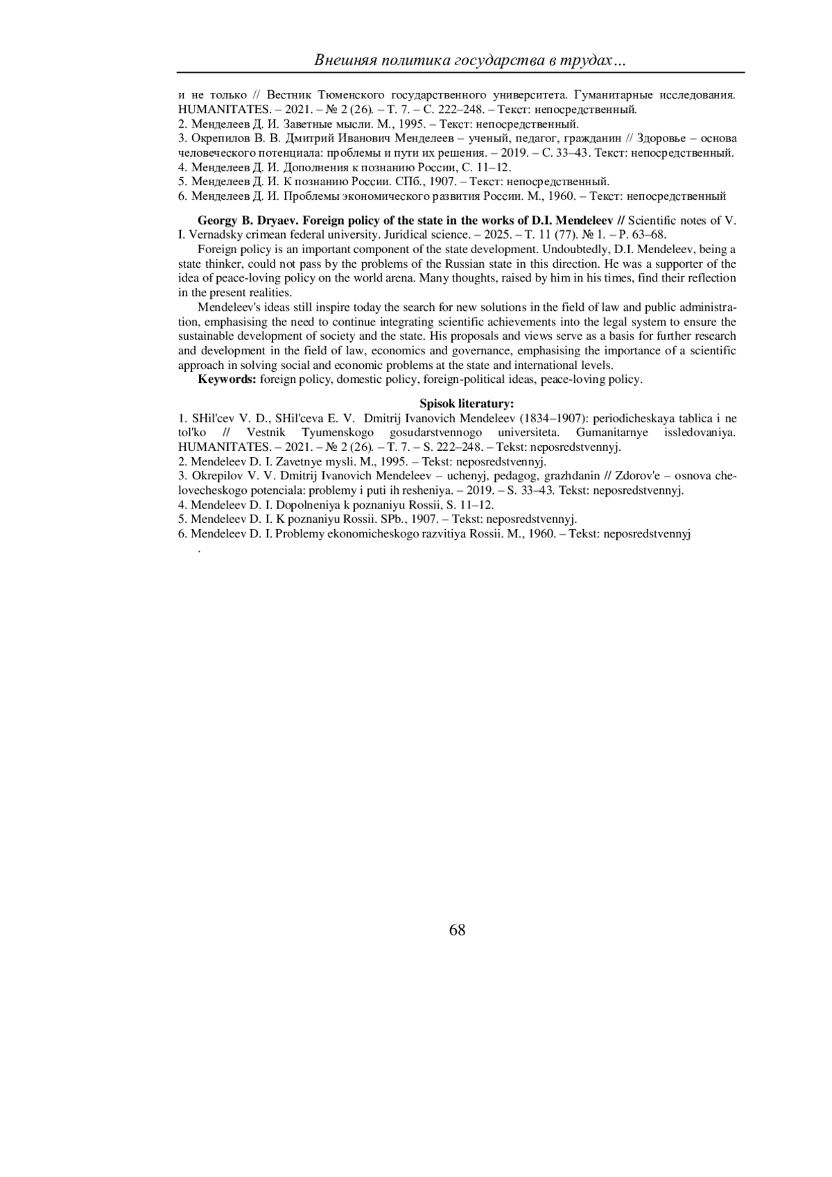 3. Окрепилов В. В. Дмитрий Иванович Менделеев - ученый, педагог, гражданин // Здоровье - основа человеческого потенциала: проблемы и пути их решения. - 2019. - С. 33-43. Текст: непосредственный. EDN: RCGTBV