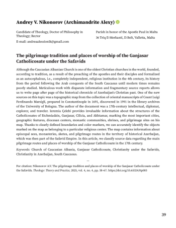 30. Никоноров А.В. Епископские кафедры Гянджасарского католикосата в XVII веке // Теология: теория и практика. 2025. Т. 4. № 3. С. 69-82.