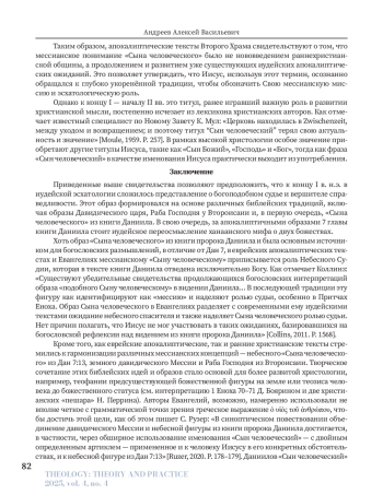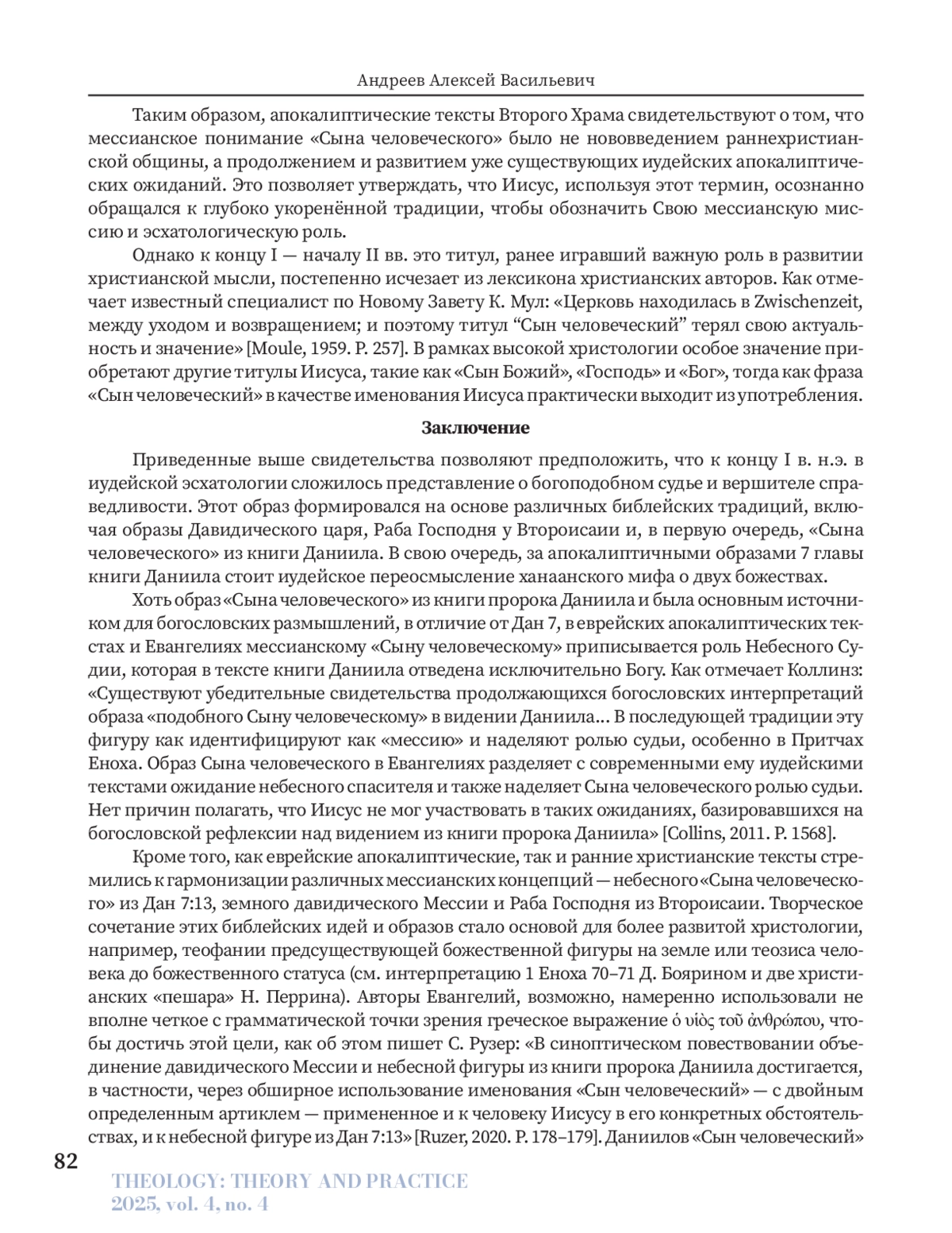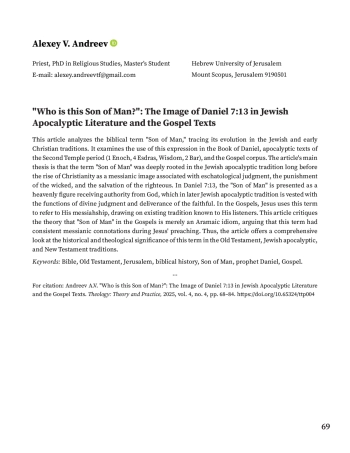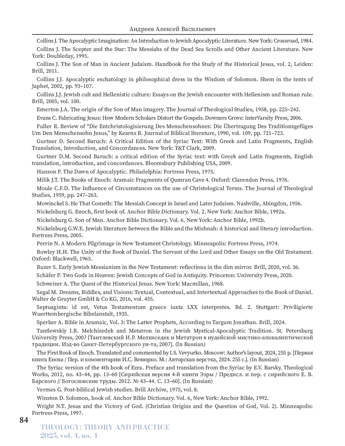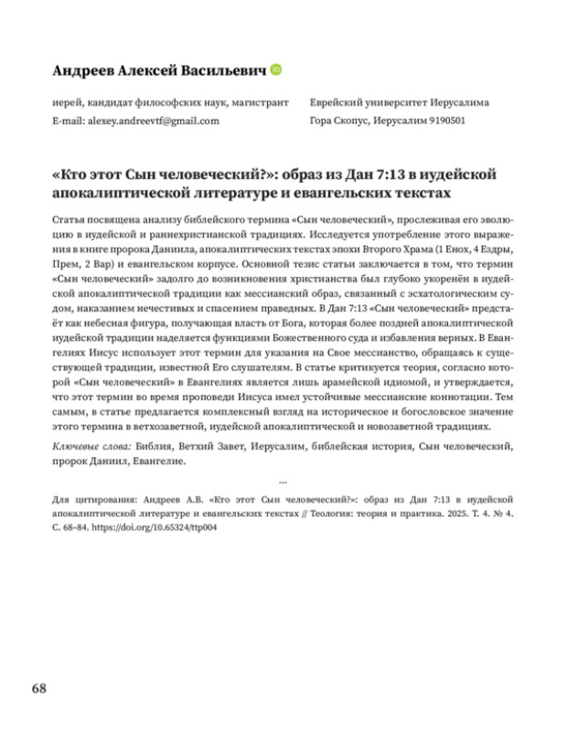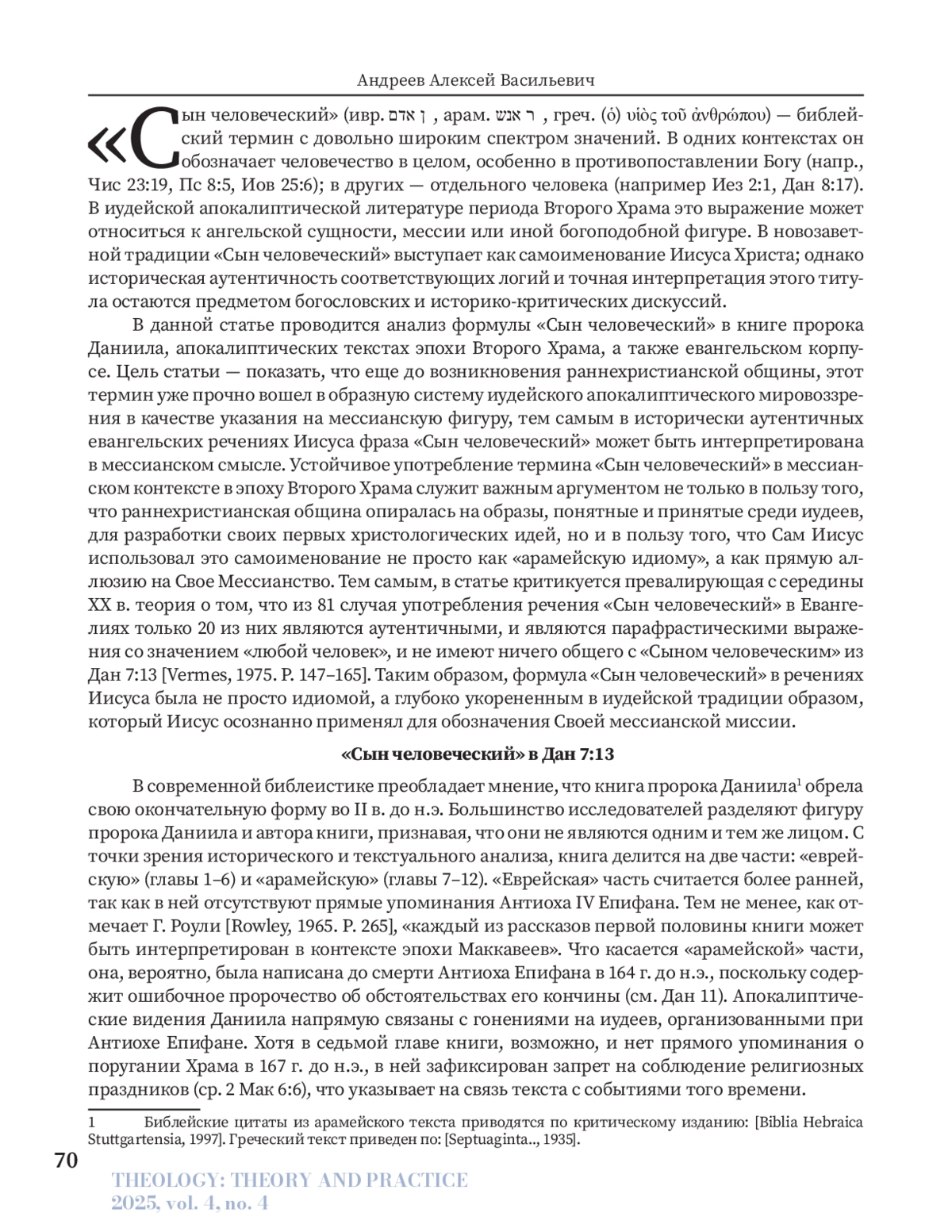 АНДРЕЕВ А. В. «КТО ЭТОТ СЫН ЧЕЛОВЕЧЕСКИЙ?»: ОБРАЗ ИЗ ДАН 7:13 В ИУДЕЙСКОЙ АПОКАЛИПТИЧЕСКОЙ ЛИТЕРАТУРЕ И ЕВАНГЕЛЬСКИХ ТЕКСТАХ // ТЕОЛОГИЯ: ТЕОРИЯ И ПРАКТИКА. 2025. № 3, ТОМ 4