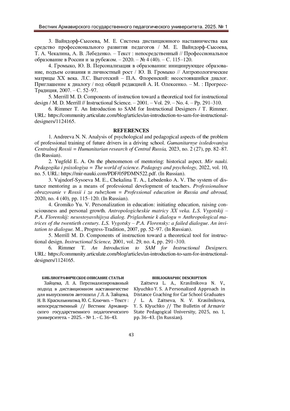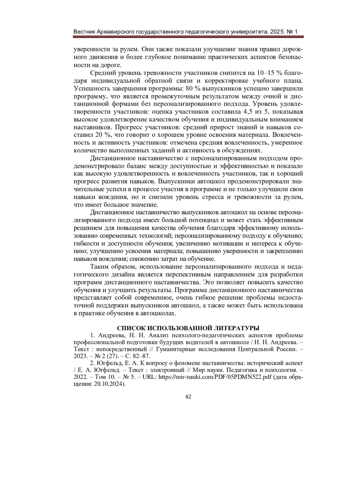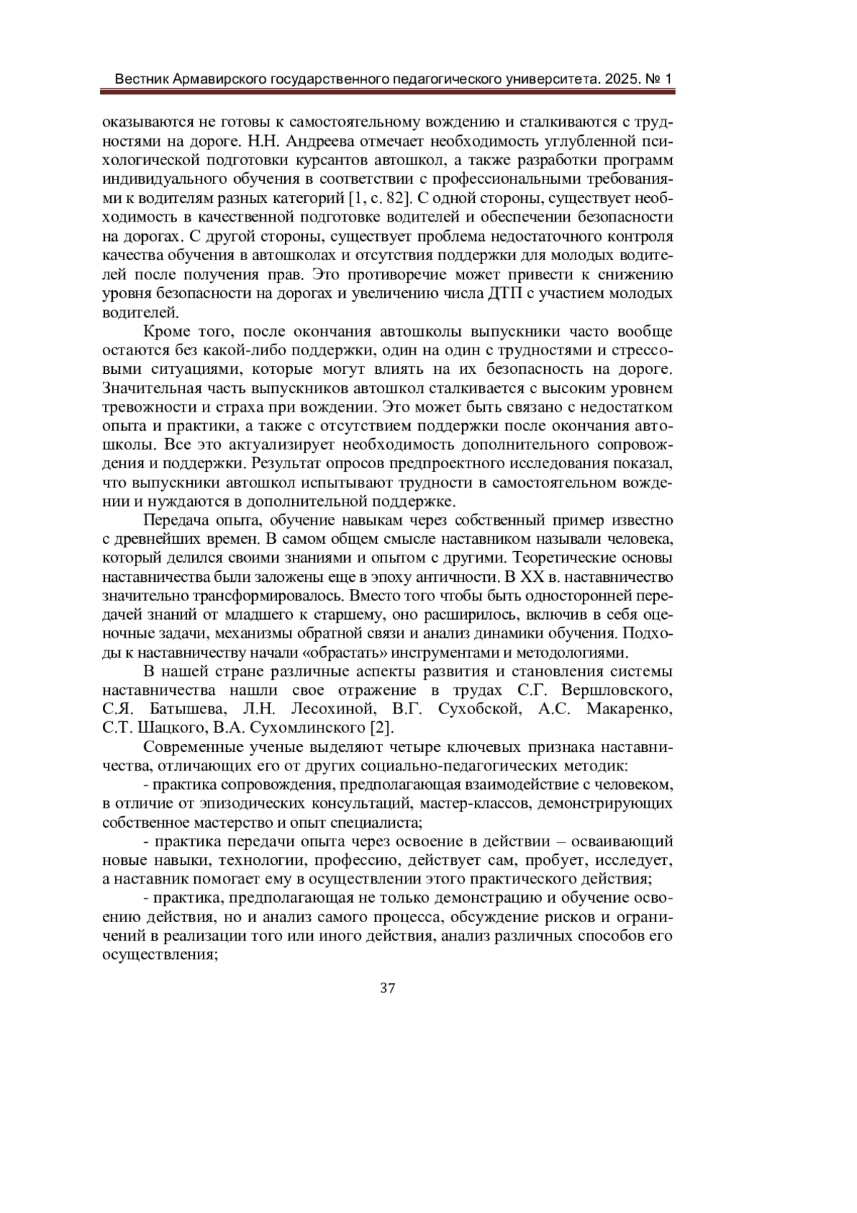 1. Андреева, Н. Н. Анализ психолого-педагогических аспектов проблемы профессиональной подготовки будущих водителей в автошколе / Н. Н. Андреева. - Текст: непосредственный // Гуманитарные исследования Центральной России. - 2023. - № 2 (27). - С. 82-87. EDN: KWAUWW