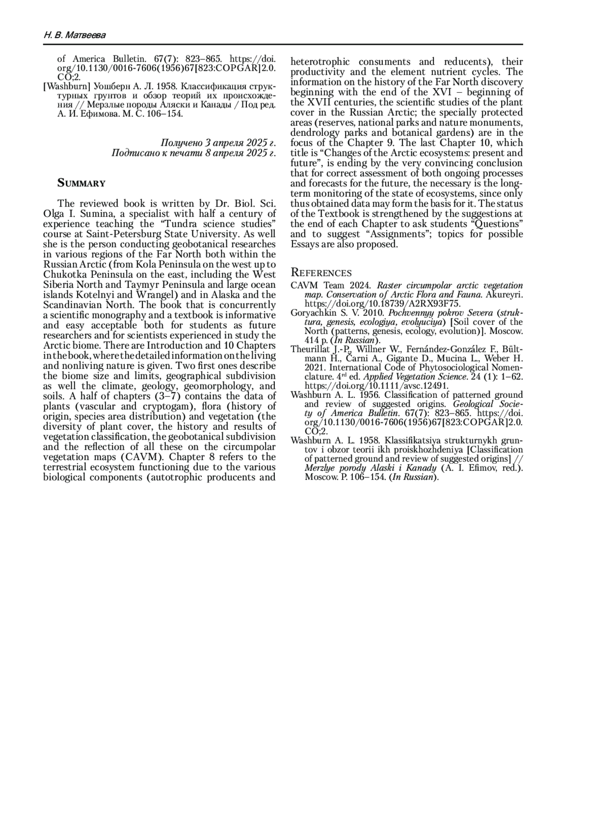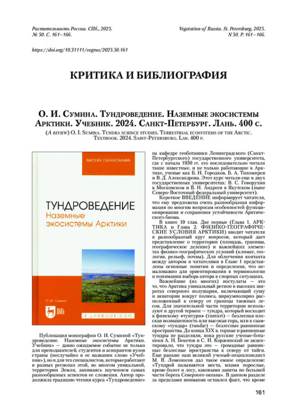 МАТВЕЕВА Н.В. О. И. СУМИНА. ТУНДРОВЕДЕНИЕ. НАЗЕМНЫЕ ЭКОСИСТЕМЫ АРКТИКИ. УЧЕБНИК. 2024. САНКТ-ПЕТЕРБУРГ. ЛАНЬ. 400 С. // РАСТИТЕЛЬНОСТЬ РОССИИ. 2025. № 50