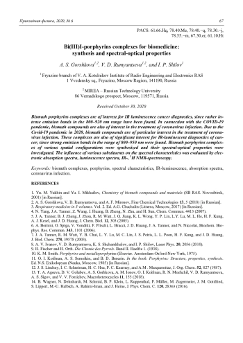 Статья: Bi(III)I-комплексы порфиринов для биомедицины: синтез и спектрально-оптические свойства (2020)