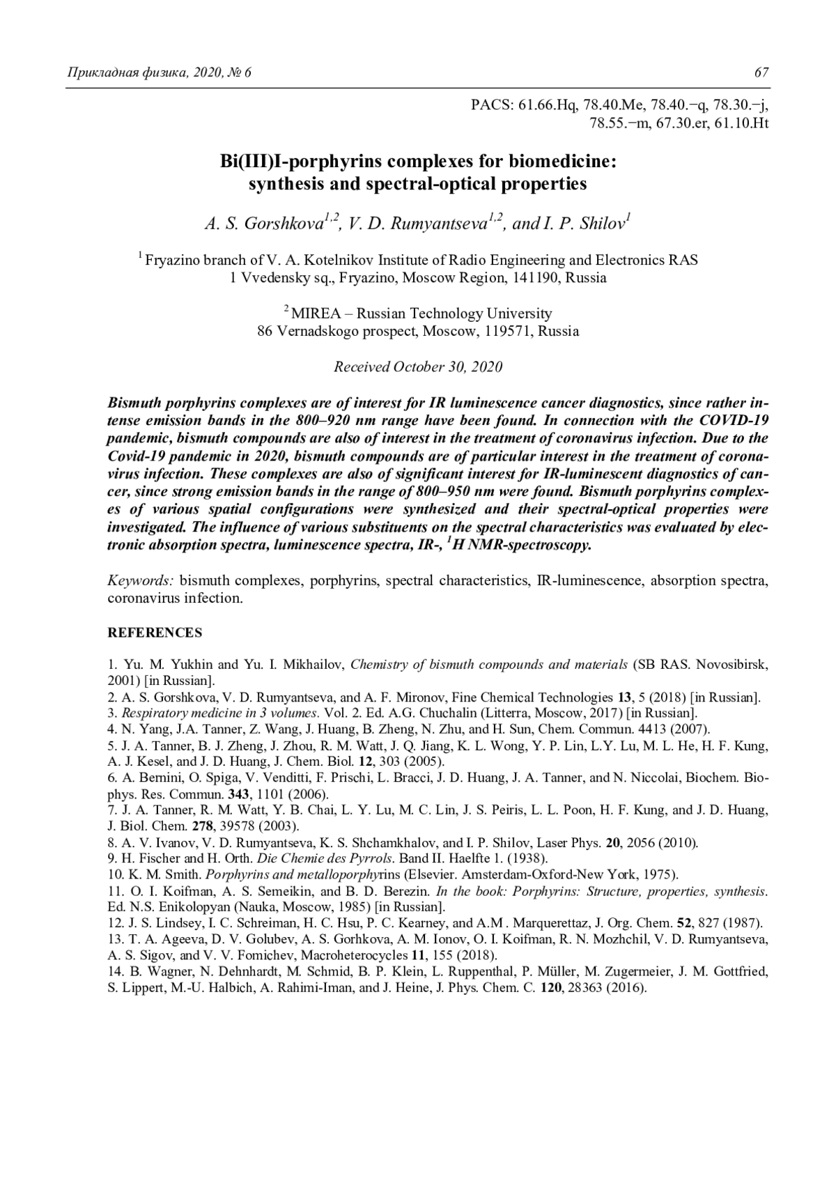 ГОРШКОВА А. С., РУМЯНЦЕВА В. Д., ШИЛОВ И. П. BI(III)I-КОМПЛЕКСЫ ПОРФИРИНОВ ДЛЯ БИОМЕДИЦИНЫ: СИНТЕЗ И СПЕКТРАЛЬНО-ОПТИЧЕСКИЕ СВОЙСТВА // ПРИКЛАДНАЯ ФИЗИКА. 2020. №6