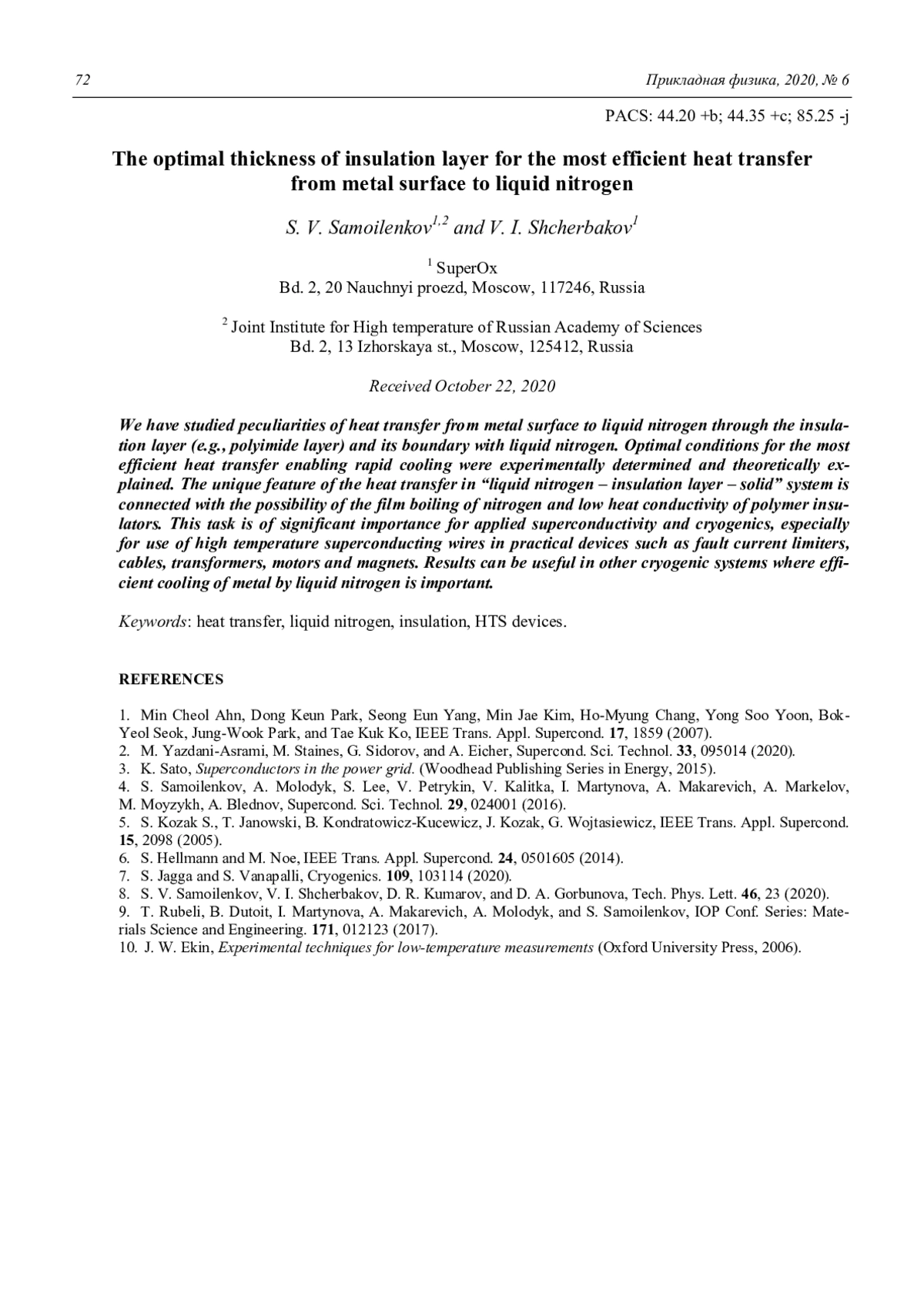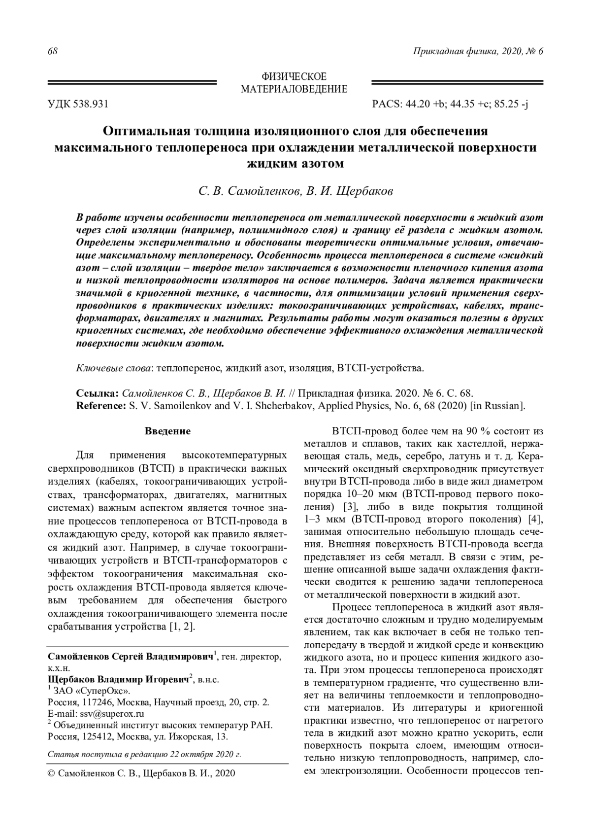 САМОЙЛЕНКОВ С. В., ЩЕРБАКОВ В. И. ОПТИМАЛЬНАЯ ТОЛЩИНА ИЗОЛЯЦИОННОГО СЛОЯ ДЛЯ ОБЕСПЕЧЕНИЯ МАКСИМАЛЬНОГО ТЕПЛОПЕРЕНОСА ПРИ ОХЛАЖДЕНИИ МЕТАЛЛИЧЕСКОЙ ПОВЕРХНОСТИ ЖИДКИМ АЗОТОМ // ПРИКЛАДНАЯ ФИЗИКА. 2020. №6