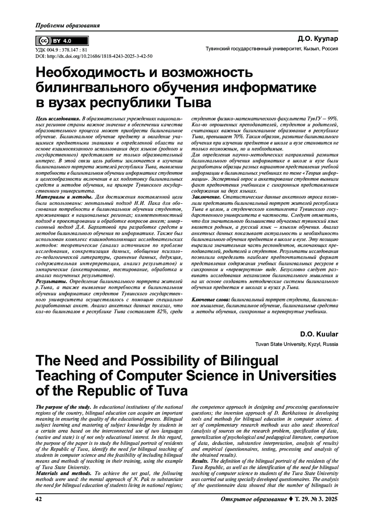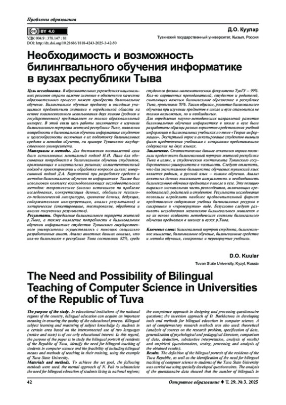 Результаты. Определение билингвального портрета жителей р. Тыва, а также выявление потребности в билингвальном обучении информатике студентов Тувинского государственного университета осуществлялось с помощью специально разработанных анкет. Анализ анкетных данных показал, что кол-во билингвалов в республике Тыва составляет 82%, среди студентов физико-математического факультета ТувГУ – 99%. Кол-во опрошенных преподавателей, студентов и родителей, считающих важным билингвальное образование в республике Тыва, превышает 70%. Таким образом, развитие билингвального обучения при изучении предметов в школе и вузе становится не только возможным, но и необходимым. Для определения научно-методических направлений развития билингвального обучения информатике в школе и вузе были разработаны образцы разных вариантов представления учебной информации в билингвальных учебниках по теме «Теория информации». Экспертный опрос и анкетирование студентов выявили факт предпочтения учебникам с синхронным представлением содержания на двух языках.