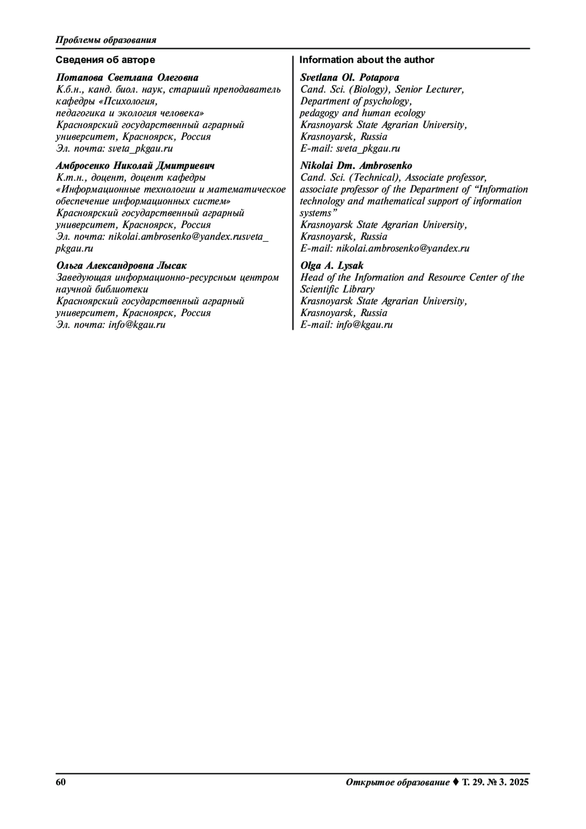 21. Амбросенко Н.Д., Лысак О.А., Потапова С.О. Показатели цифровой активности пользователей ЭБС в Красноярском ГАУ и способы их повышения // Наука и образование: опыт, проблемы, перспективы развития: Материалы международной научно-практической конференции (16-18 апреля 2024 г., Красноярск). Красноярск: Красноярский государственный аграрный университет, 2024. С. 561-564.