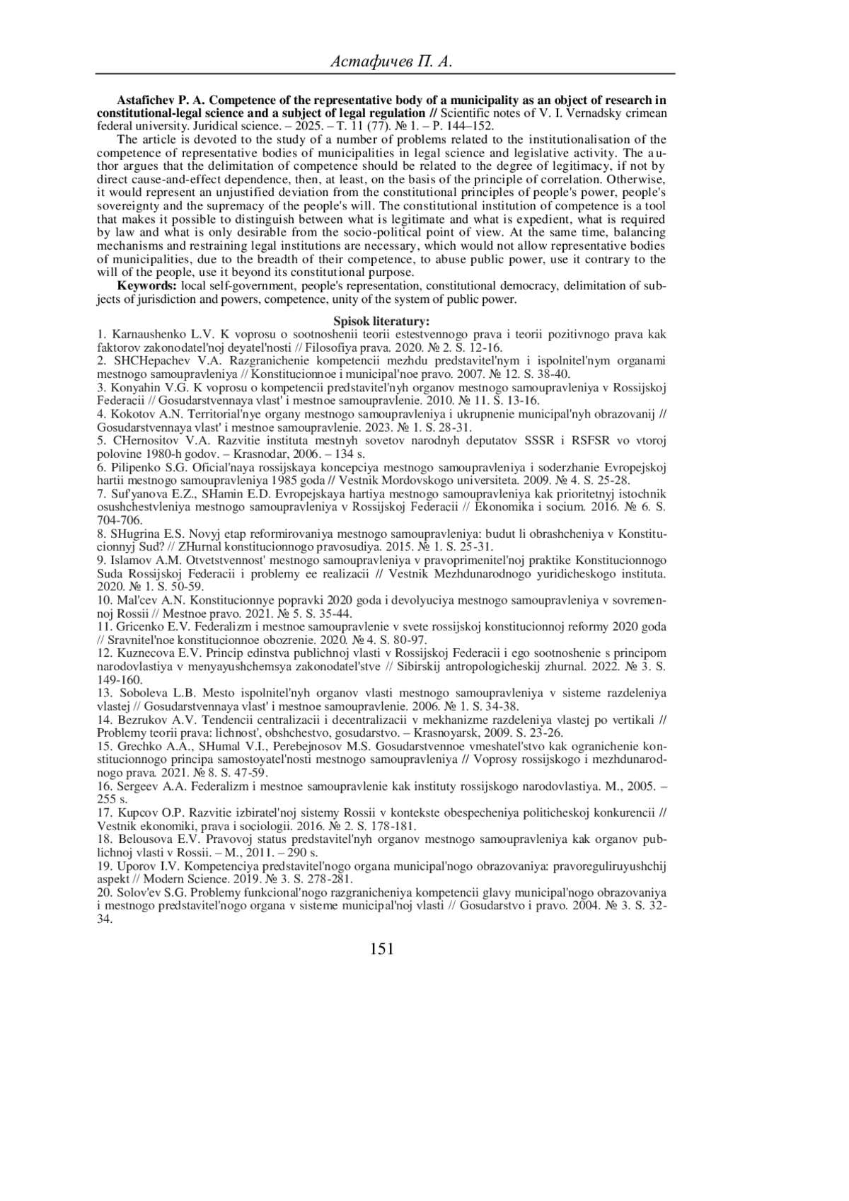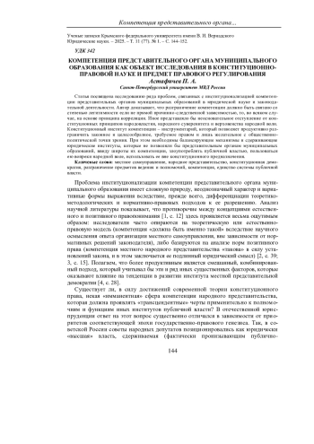 АСТАФИЧЕВ П. А. КОМПЕТЕНЦИЯ ПРЕДСТАВИТЕЛЬНОГО ОРГАНА МУНИЦИПАЛЬНОГО ОБРАЗОВАНИЯ КАК ОБЪЕКТ ИССЛЕДОВАНИЯ В КОНСТИТУЦИОННО-ПРАВОВОЙ НАУКЕ И ПРЕДМЕТ ПРАВОВОГО РЕГУЛИРОВАНИЯ // УЧЕНЫЕ ЗАПИСКИ КРЫМСКОГО ФЕДЕРАЛЬНОГО УНИВЕРСИТЕТА ИМЕНИ В. И. ВЕРНАДСКОГО. ЮРИДИЧЕСКИЕ НАУКИ. 2025. ТОМ 11(77). №1