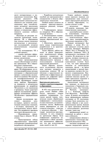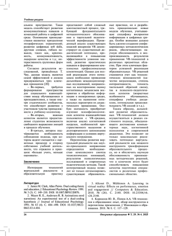 Заключение. В результате анализа успешных кейсов, реализованных в различных университетах, автором систематизированы модели организации учебного процесса с использованием VR-технологий. Рассмотренные вопросы могут стать основой для разработки стандартов VR-обучения, создания адаптивных образовательных программ и рекомендаций для педагогов и разработчиков EdTech.