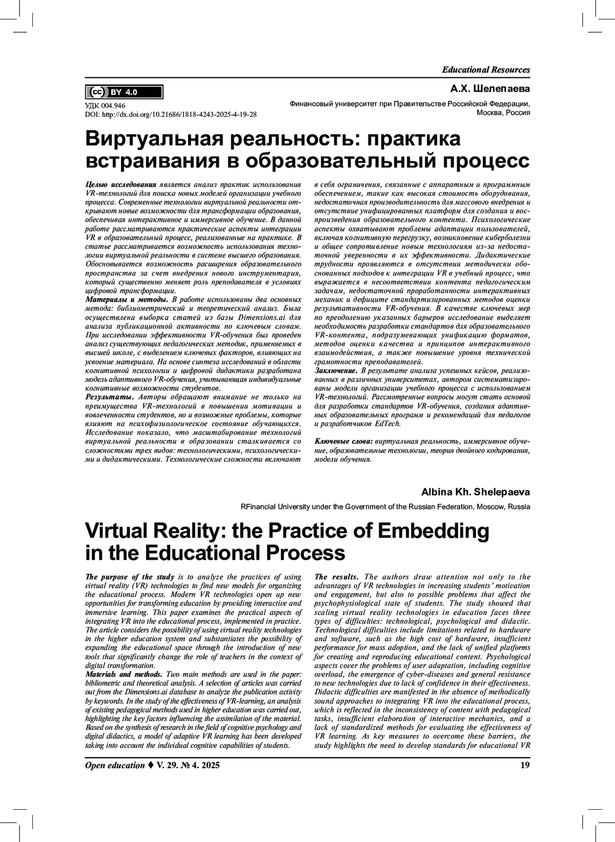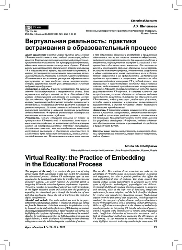 Результаты. Авторы обращают внимание не только на преимущества VR-технологий в повышении мотивации и вовлеченности студентов, но и возможные проблемы, которые влияют на психофизиологическое состояние обучающихся. Исследование показало, что масштабирование технологий виртуальной реальности в образовании сталкивается со сложностями трех видов: технологическими, психологическими и дидактическими. Технологические сложности включают в себя ограничения, связанные с аппаратным и программным обеспечением, такие как высокая стоимость оборудования, недостаточная производительность для массового внедрения и отсутствие унифицированных платформ для создания и воспроизведения образовательного контента. Психологические аспекты охватывают проблемы адаптации пользователей, включая когнитивную перегрузку, возникновение киберболезни и общее сопротивление новым технологиям из-за недостаточной уверенности в их эффективности. Дидактические трудности проявляются в отсутствии методически обоснованных подходов к интеграции VR в учебный процесс, что выражается в несоответствии контента педагогическим задачам, недостаточной проработанности интерактивных механик и дефиците стандартизированных методов оценки результативности VR-обучения. В качестве ключевых мер по преодолению указанных барьеров исследование выделяет необходимость разработки стандартов для образовательного VR-контента, подразумевающих унификацию форматов, методов оценки качества и принципов интерактивного взаимодействия, а также повышение уровня технической грамотности преподавателей.