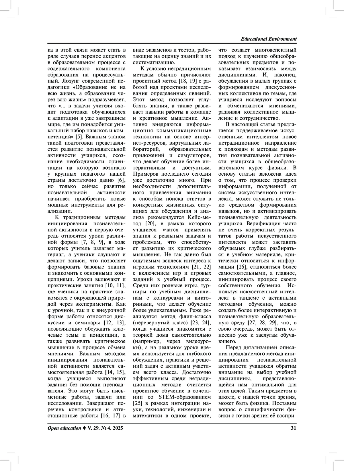 Цель исследования. Проблема инициирования познавательной активности учащихся приобретает в настоящее время постоянно возрастающую значимость. Понимание практической невозможности передачи в процессе обучения объемов информации, необходимых для формирования широкого спектра требуемых компетенций, заставляет искать новые дидактические подходы к достижению цели, в числе которых - ориентация на развитие познавательной активности. Важнейшим инструментом для этого могут стать системы искусственного интеллекта, сферы применения которых в последние два-три года стремительно расширяются. Однако в учебном процессе обращение к искусственному интеллекту не всеми воспринимается позитивно. Хорошо известны дискуссии о неэтичности выполнения учебных заданий с помощью ChatGPT или подобных систем. Поиск приемлемых и эффективных решений был поставлен авторами настоящей работы в качестве основной цели исследования. Еще одной целевой установкой явилась попытка разработки и введения в практику обучения на уровне общего образования нового нетрадиционного метода, основанного на возможности инициирования познавательной активности учащихся через системы искусственного интеллекта. Третьей целью представлялось обоснование выбора физики как учебной дисциплины среди некоторых других для иллюстрации эффективности предлагаемого метода обучения в общеобразовательном курсе физики.
