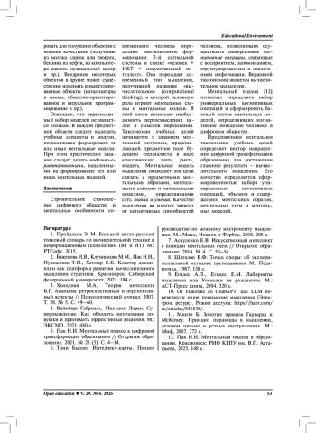 Заключение. Предложенная ментальная таксономия учебных целей определяет вектор направления цифровой трансформации образования для достижения главного результата – вычислительного мышления. Этапность формирования и качество вычислительного мышления определяется сформированностью набора универсальных когнитивных операций, объемом и содержанием ментальных образов, ментальных схем и ментальных моделей предметной области.