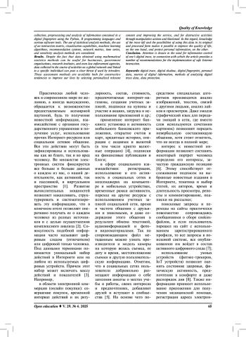 Материалы и методы. В статье достаточно подробно рассмотрены различные методы математической статистики для оценки цифрового следа пользователя сети, приведены этапы, позволяющие осуществить сбор, предобработку и анализ информации, содержащейся в цифровом отпечатке, с применением языков программирования Python, R и различных программных инструментов. Рассмотрено использование статистических методов анализа, применение матрицы взаимодействий, возможности визуализации, алгоритмов машинного обучения, рекомендательных систем, сетевых метрик, временных рядов и методы анализа чувствительности.