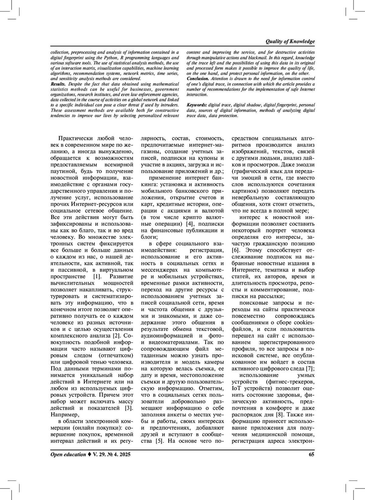 Результаты. Несмотря на то, что данные полученные с использованием методов математической статистики могут быть полезны для бизнеса, правительственных организаций, научно-исследовательских институтов и даже правоохранительных органов, данные собираемые в процессе деятельности в глобальной сети и имеющие привязку к конкретной личности могут нести явную угрозу в случае их использования злоумышленниками. Эти методы оценки доступны как для конструктивной тенденции по улучшению нашей жизни путем подбора персонифицированного релевантного контента и улучшения сервиса, так и для деструктивной деятельности через манипуляторные действия и шантаж. В связи с этим знание оставляемого следа и возможностей использования этих данных в первоначальном и обработанном виде позволяет улучшить качество жизни, с одной стороны, и защитить персональную информацию с другой.