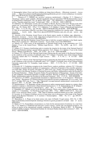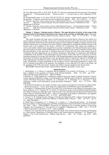 ЗУБАРЕВ Н. В. НАЦИОНАЛЬНАЯ БЕЗОПАСНОСТЬ РОССИИ - ОСНОВНОЕ НАПРАВЛЕНИИ ДЕЯТЕЛЬНОСТИ ВОЙСК НАЦИОНАЛЬНОЙ ГВАРДИИ РОССИЙСКОЙ ФЕДЕРАЦИИ В УСЛОВИЯХ ДЕЯТЕЛЬНОСТИ НЕДРУЖЕСТВЕННЫХ ГОСУДАРСТВ (ПРОДОЛЖЕНИЕ) // УЧЕНЫЕ ЗАПИСКИ КРЫМСКОГО ФЕДЕРАЛЬНОГО УНИВЕРСИТЕТА ИМЕНИ В. И. ВЕРНАДСКОГО. ЮРИДИЧЕСКИЕ НАУКИ. 2025. ТОМ 11(77). №1