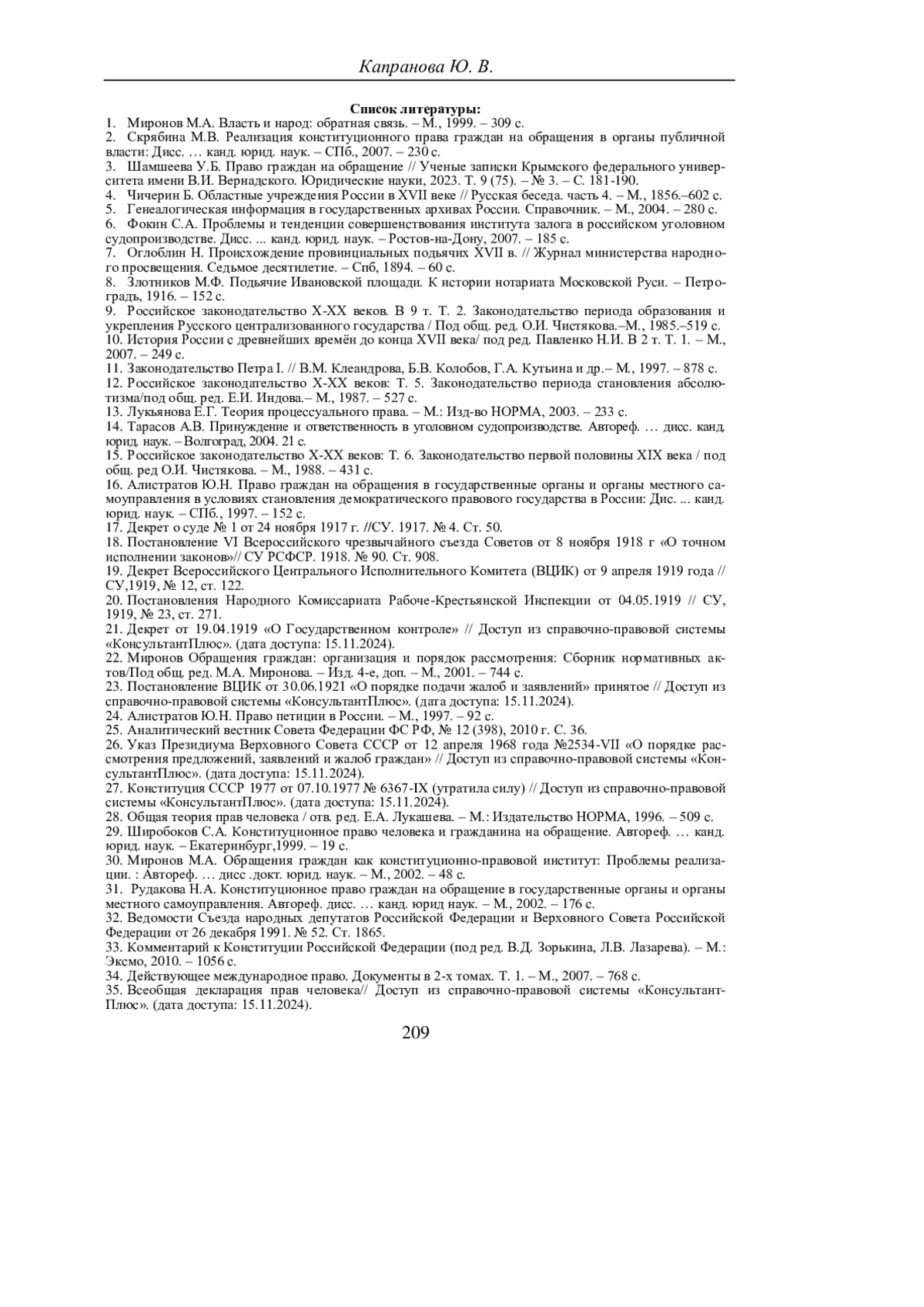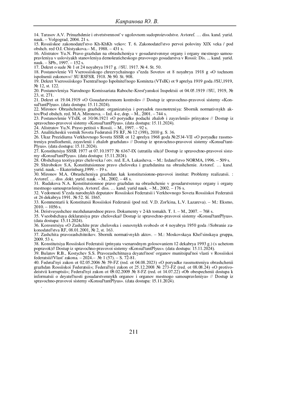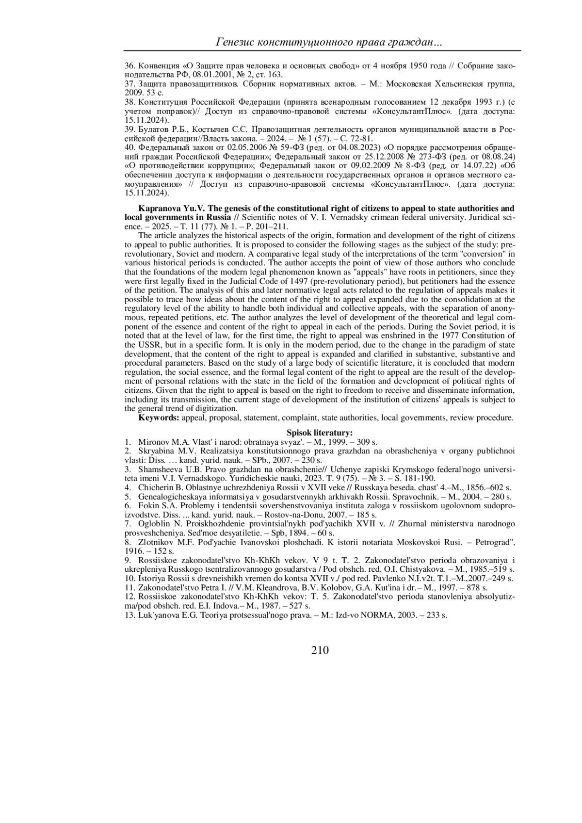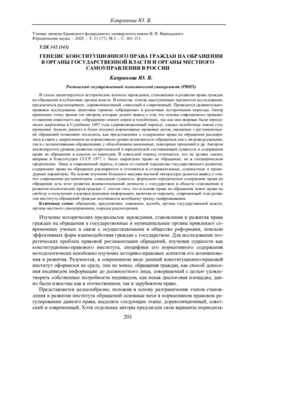 КАПРАНОВА Ю. В. ГЕНЕЗИС КОНСТИТУЦИОННОГО ПРАВА ГРАЖДАН НА ОБРАЩЕНИЯ В ОРГАНЫ ГОСУДАРСТВЕННОЙ ВЛАСТИ И ОРГАНЫ МЕСТНОГО САМОУПРАВЛЕНИЯ В РОССИИ // УЧЕНЫЕ ЗАПИСКИ КРЫМСКОГО ФЕДЕРАЛЬНОГО УНИВЕРСИТЕТА ИМЕНИ В. И. ВЕРНАДСКОГО. ЮРИДИЧЕСКИЕ НАУКИ. 2025. ТОМ 11(77). №1