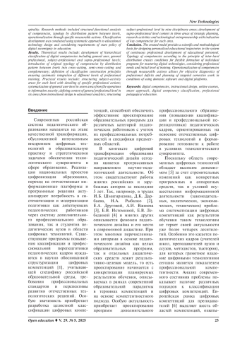 Результаты. К теоретическим результатам относятся: разработка иерархической классификации цифровых компетенций, включающей общепользовательский, общепрофессиональный, предметно-профессиональный и надпрофессиональный уровни; введение оригинальной типологии компетенций по характеру их распределения между уровнями на сквозные, полусквозные и комплиментарные; определение принципов построения классификации, обеспечивающих системную интеграцию различных уровней профессиональной подготовки. К практическим результатам относятся: структурирование предметно-деятельностных областей для каждого уровня с детализацией конкретных профессиональных действий; систематизация общепользовательского уровня в семи областях от файловых операций до информационной безопасности; определение содержания общепрофессионального уровня в шести областях от педагогического проектирования до образовательной аналитики; структурирование предметно-профессионального уровня по девяти дисциплинарным областям; разработка содержания надпрофессионального уровня в трех областях стратегического планирования, исследовательской деятельности и технологического предпринимательства с указанием ключевых компетенций для каждой области.