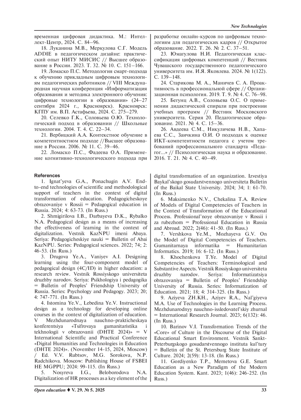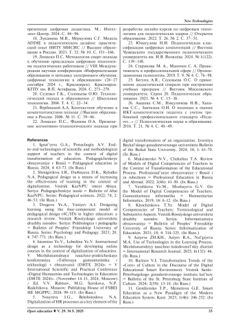 Заключение. Созданная модель обеспечивает научно-методологическую базу для проектирования персонализированных образовательных траекторий в системе непрерывного профессионального развития педагогических кадров. Типологизация компетенций по принципу межуровневого распределения создает условия для гибкого формирования индивидуальных программ освоения цифровых технологий с учетом профессиональных потребностей и начального уровня подготовки. Операционализация компетенций через измеримые действия позволяет осуществлять объективную диагностику профессиональных дефицитов и планировать целенаправленную коррекционную работу в условиях использования отечественного программного обеспечения и цифровых платформ.