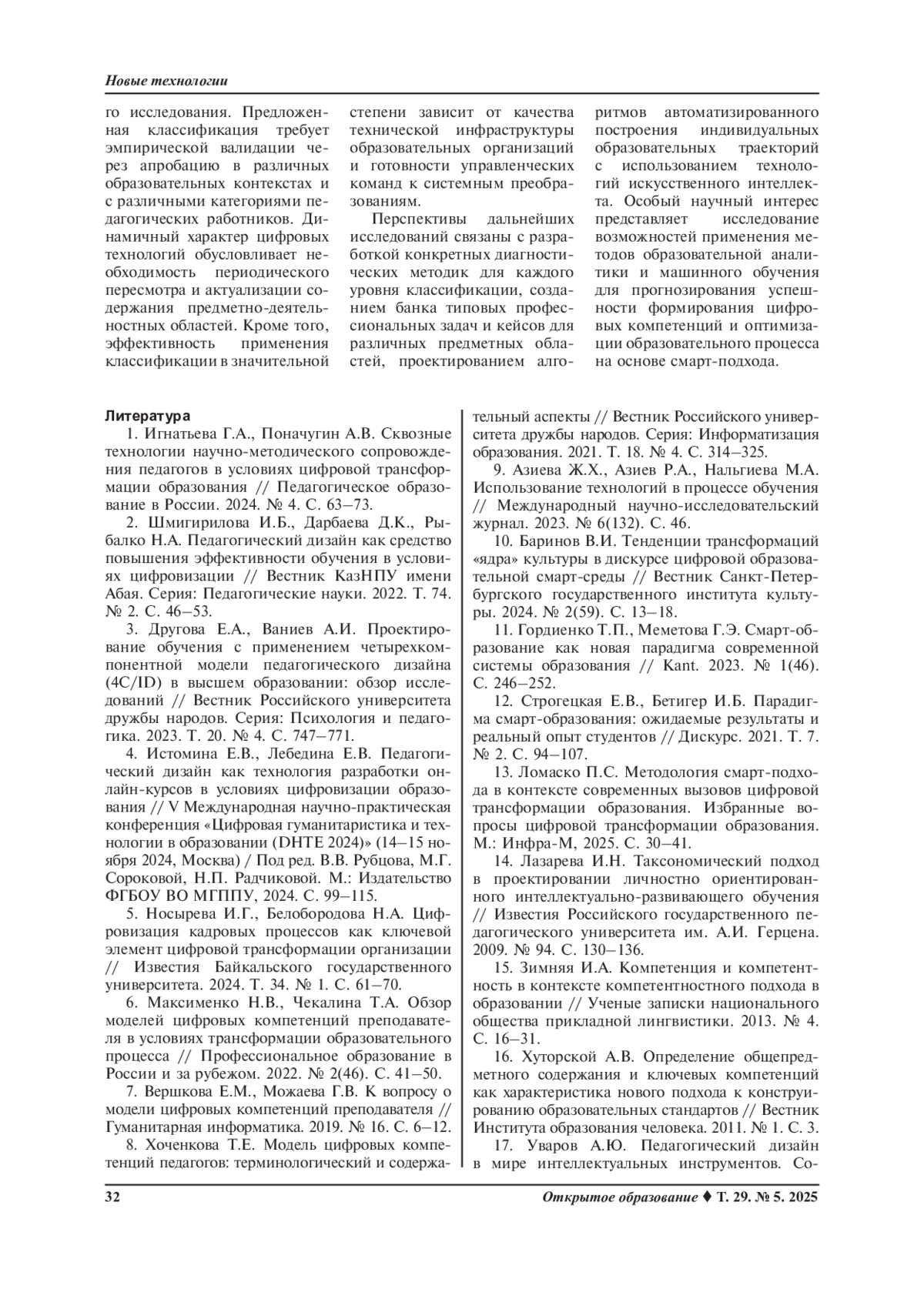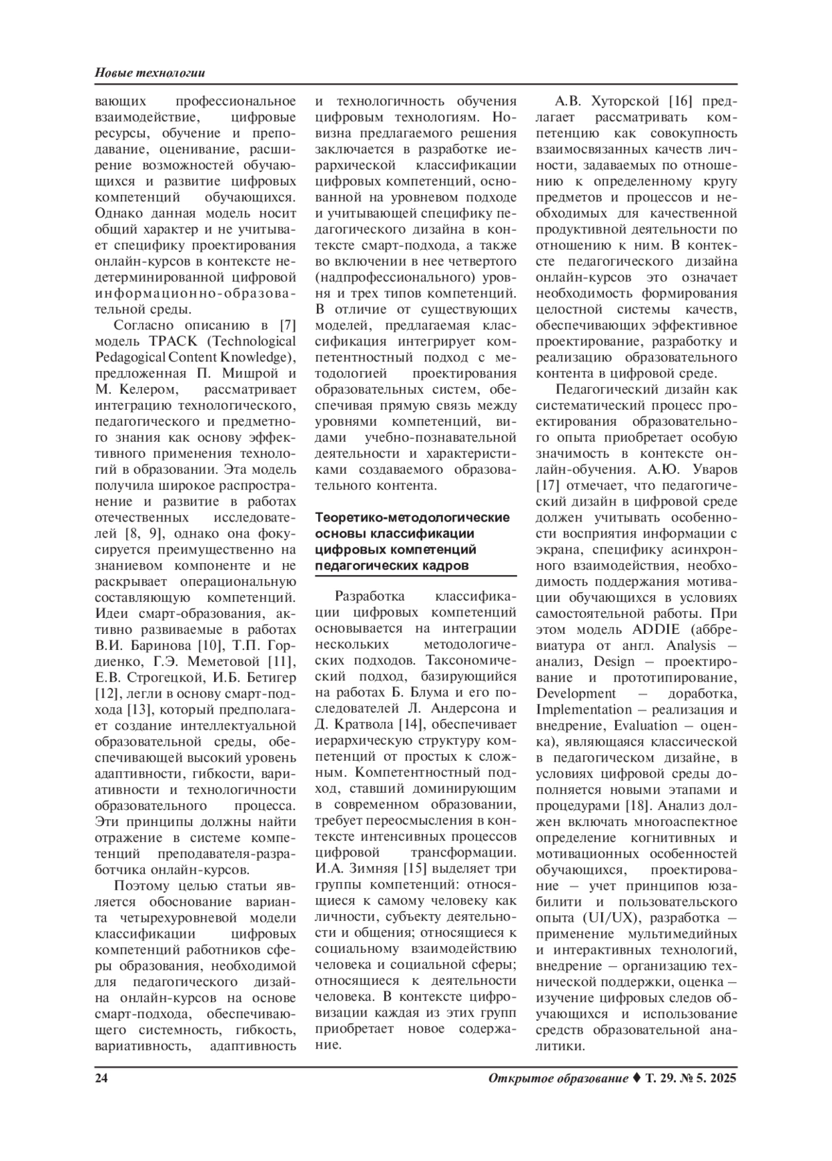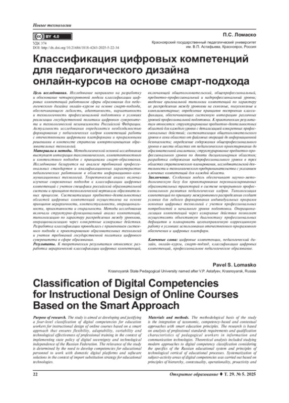 Цель исследования. Исследование направлено на разработку и обоснование четырехуровневой модели классификации цифровых компетенций работников сферы образования для педагогического дизайна онлайн-курсов на основе смарт-подхода, обеспечивающего гибкость, адаптивность, вариативность и технологичность профессиональной подготовки в условиях реализации государственной политики цифрового суверенитета и технологической независимости Российской Федерации. Актуальность исследования определяется необходимостью формирования у педагогических кадров компетенций работы с отечественными цифровыми платформами и программными решениями в контексте стратегии импортозамещения образовательных технологий.
