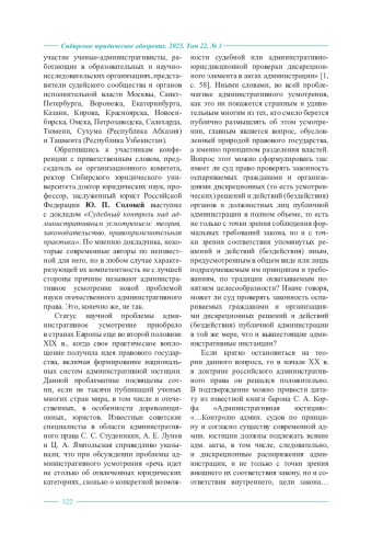 Обзор содержит основные положения докладов участников всероссийской научно-практической конференции «Судебный контроль над административным усмотрением: теория, законодательство, правоприменительная практика», состоявшейся 30 мая 2025 г. в частном образовательном учреждении высшего образования «Сибирский юридический университет» (Омск). В рамках темы конференции ее участники обсудили такие вопросы, как дискреционность в нормотворчестве и административном правоприменении, прикладные аспекты теории административного усмотрения, административный произвол и материальный судебный контроль, пределы административного усмотрения, особенности реализации административного усмотрения при издании процессуальных и внепроцессуальных административных актов, усмотрение публичной администрации как объект административного правосудия и как предмет судебного контроля, правовая подчиненность административного усмотрения судебной юрисдикции, контроль над административным усмотрением при применении мер административного принуждения, судебный контроль обоснования контрольными (надзорными) органами наличия «непосредственной угрозы», основания судебного вмешательства в административное усмотрение при рассмотрении дел об административных правонарушениях, административно-процессуальные принципы судебного контроля над административным усмотрением, пределы полномочий суда в рамках судопроизводства по делам об оспаривании административно-правовых актов и другие. По результатам состоявшейся дискуссии участники конференции единогласным голосованием приняли резолюцию, в которой признали целесообразной разработку проекта Постановления Пленума Верховного Суда Российской Федерации (в форме самостоятельного акта или акта, изменяющего и дополняющего Постановление Пленума Верховного Суда Российской Федерации от 28 июня 2022 г. № 21 «О некоторых вопросах применения судами положений главы 22 Кодекса административного судопроизводства Российской Федерации и главы 24 Арбитражного процессуального кодекса Российской Федерации») и (или) обзора судебной практики Верховного Суда Российской Федерации, содержащих развернутые положения о критериях судебной проверки законности дискреционных решений, действий (бездействия) органов государственной власти, иных государственных органов, органов местного самоуправления, должностных лиц, государственных или муниципальных служащих, иных органов и лиц, наделенных публичными полномочиями.
