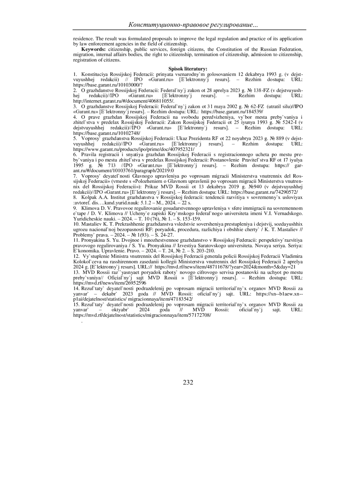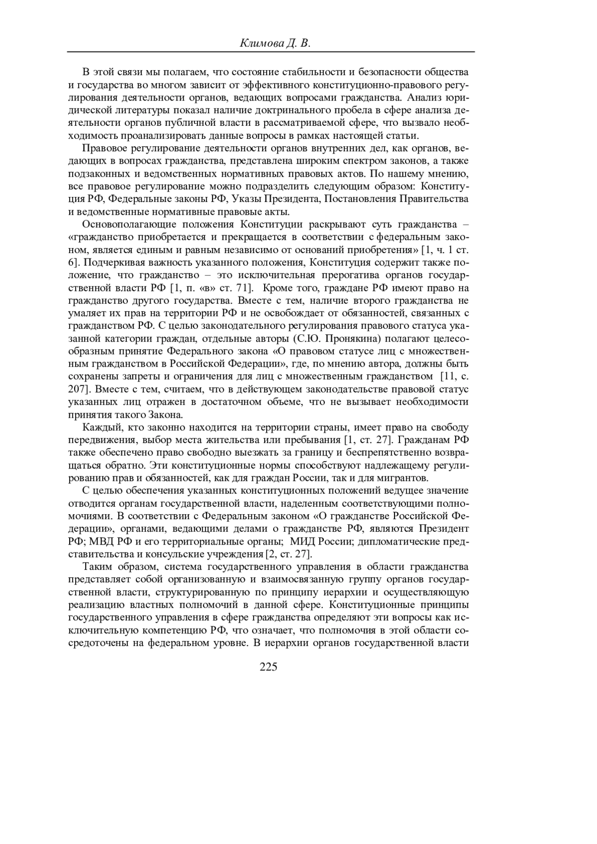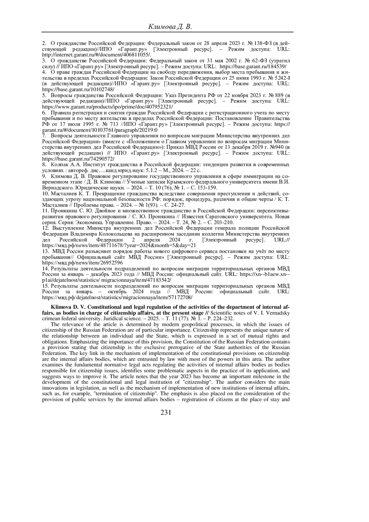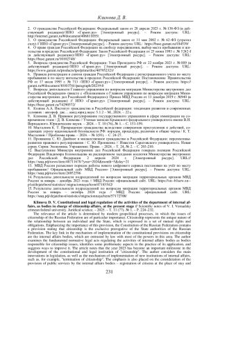 КЛИМОВА Д. В. КОНСТИТУЦИОННО-ПРАВОВОЕ РЕГУЛИРОВАНИЕ ДЕЯТЕЛЬНОСТИ ОВД, КАК ОРГАНОВ, ВЕДАЮЩИХ ДЕЛАМИ О ГРАЖДАНСТВЕ, НА СОВРЕМЕННОМ ЭТАПЕ // УЧЕНЫЕ ЗАПИСКИ КРЫМСКОГО ФЕДЕРАЛЬНОГО УНИВЕРСИТЕТА ИМЕНИ В. И. ВЕРНАДСКОГО. ЮРИДИЧЕСКИЕ НАУКИ. 2025. ТОМ 11(77). №1