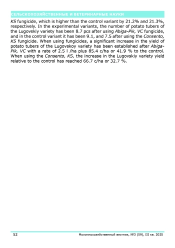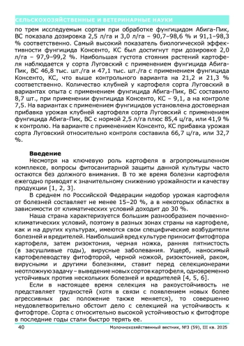 В среднем по Российской Федерации недобор урожая картофеля от болезней составляет не менее 15–20 %, а в некоторых областях в зависимости от климатических условий доходит до 30 %. Оценка биологической эффективности фунгицидов при возделывании сортов картофеля в условиях Рязанской области явилась целью проведения исследований, которые осуществлялись в 2022–2024 гг. Почва на опытных участках темно-серая лесная. Объектами исследования явились три среднеспелых сорта картофеля – Луговский, Утро, Прайм и фунгициды Абига-Пик, ВС и Консенто, КС. Исследования проводились по стандартным методикам. При обработке Абига-Пик, ВС в дозе 2,5 л/га и 3 л/га показатель развития фитофтороза колебался от 0,1 до 0,4 % без значительных отклонений. В варианте с фунгицидом Консенто, КС в дозе 2 л/га развитие фитофтороза по трем сортам за годы исследований в среднем колебалась от 0,1 до 0,3 %. По значению биологической эффективности наиболее высокие показатели по трем исследуемым сортам при обработке фунгицидом Абига-Пик, ВС показала дозировка 2,5 л/га и 3,0 л/га – 90,7–98,6 % и 91,1–98,3 % соответственно. Самый высокий показатель биологической эффективности фунгицида Консенто, КС был достигнут при дозировке 2,0 л/га – 97,9–99,2 %. Наибольшая густота стояния растений картофеля наблюдается у сорта Луговский с применением фунгицида АбигаПик, ВС 46,8 тыс. шт./га и 47,1 тыс. шт./га с применением фунгицида Консенто, КС, что выше контрольного варианта на 21,2 и 21,3 % соответственно. Количество клубней у картофеля сорта Луговский в вариантах опыта с применением фунгицида Абига-Пик, ВС составило 8,7 шт., при применении фунгицида Консенто, КС – 9,1, а на контроле 7,5. На вариантах с применением фунгицидов установлена достоверная прибавка урожая клубней картофеля сорта Луговский с применением фунгицида Абига-Пик, ВС с нормой 2,5 л/га плюс 85,4 ц/га, или 41,9 % к контролю. На варианте с применением Консенто, КС прибавка урожая сорта Луговский относительно контроля составила 66,7 ц/га, или 32,7 %.