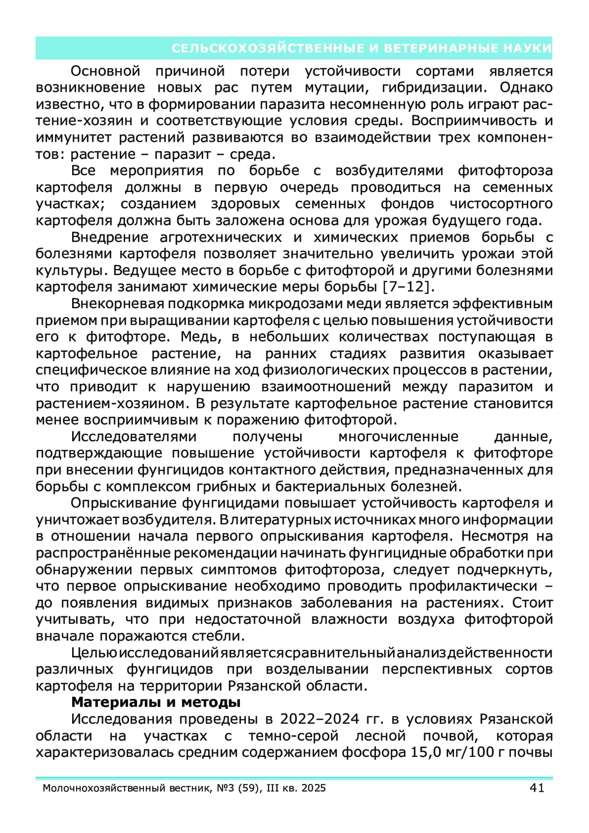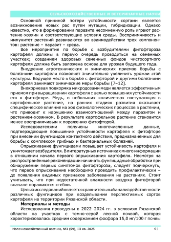 Несмотря на ключевую роль картофеля в агропромышленном комплексе, вопросы фитосанитарной защиты данной культуры часто остаются без должного внимания. В то же время болезни картофеля ежегодно приводят к значительному снижению урожайности и качеству продукции [1, 2, 3].