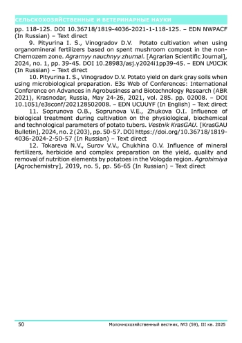 10. Pityurina I. S., Vinogradov D.V. Potato yield on dark gray soils when using microbiological preparation. E3s Web of Conferences: International Conference on Advances in Agrobusiness and Biotechnology Research (ABR 2021), Krasnodar, Russia, May 24-26, 2021, vol. 285. pp. 02008. -. DOI: 10.1051/e3sconf/202128502008