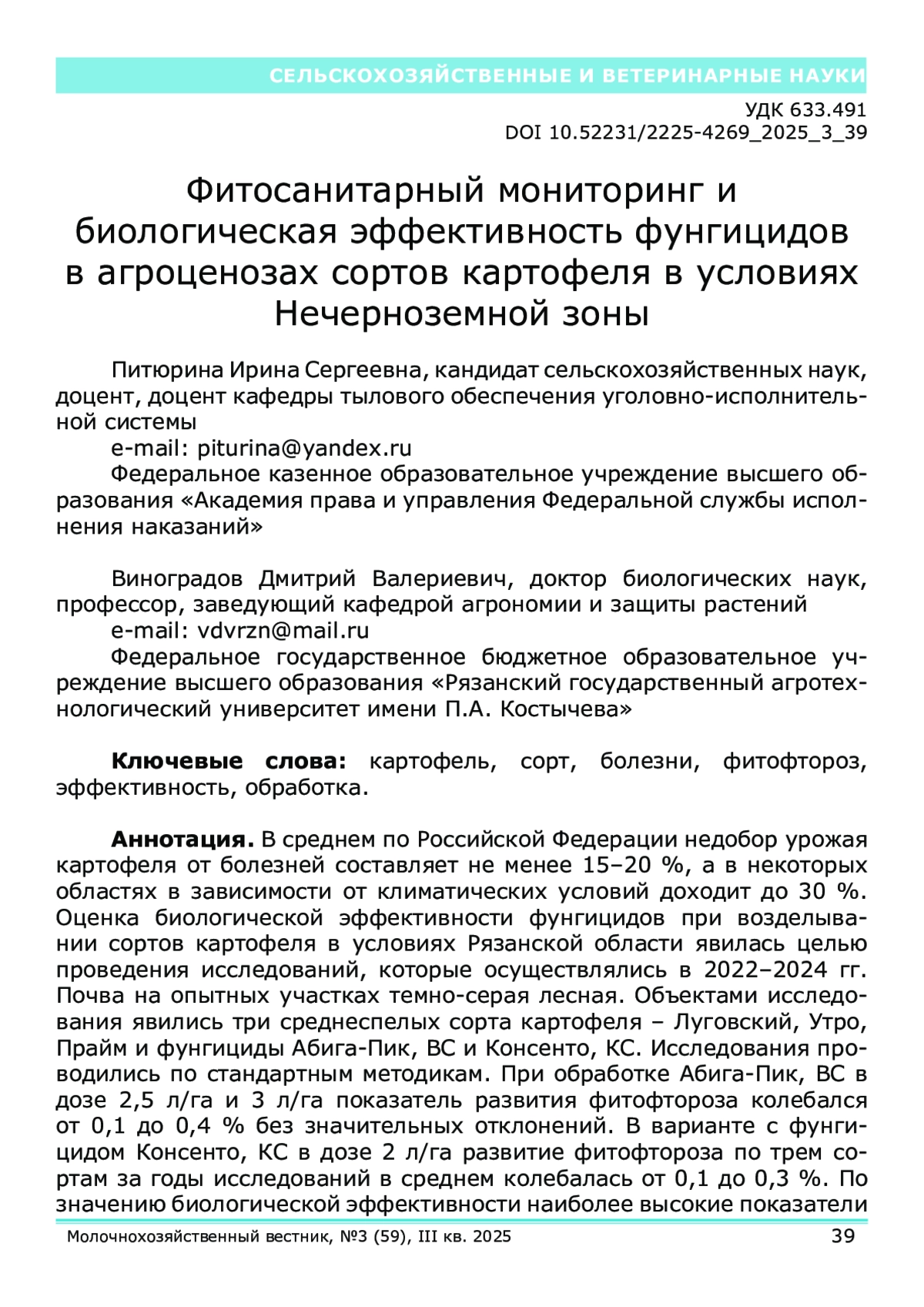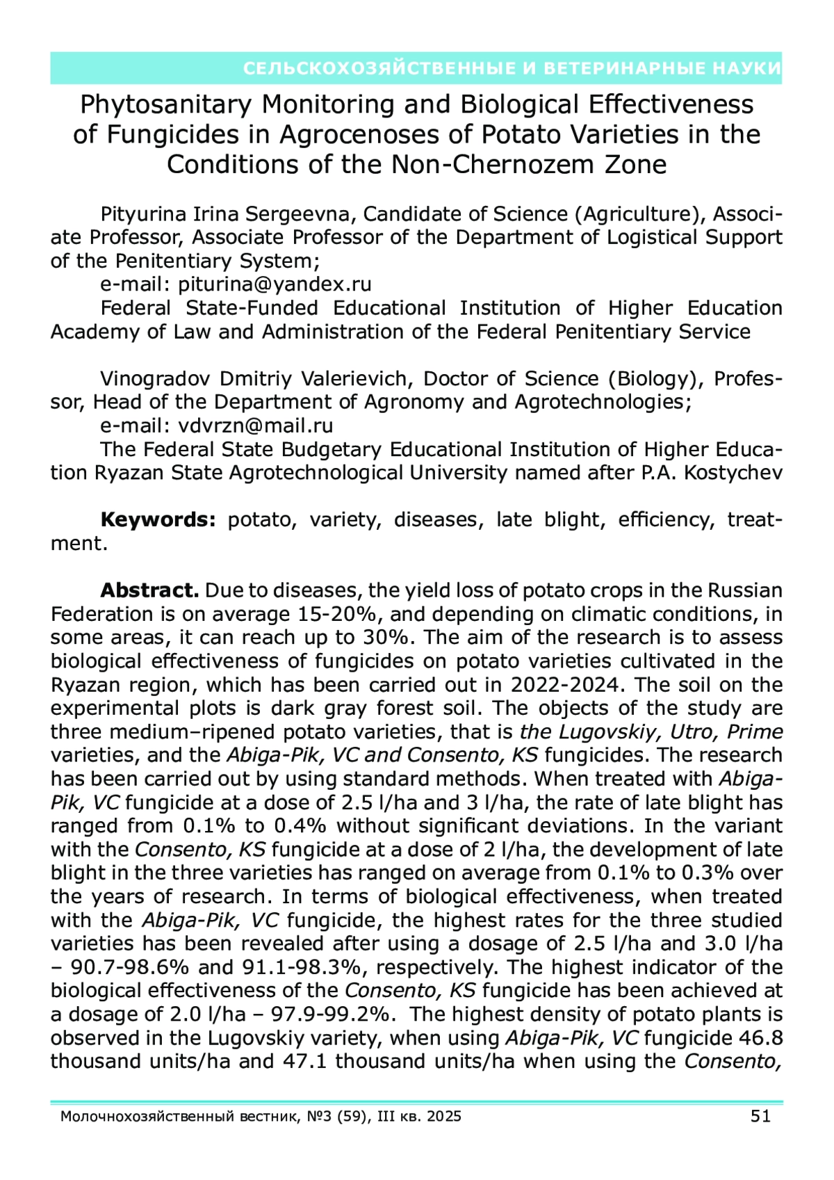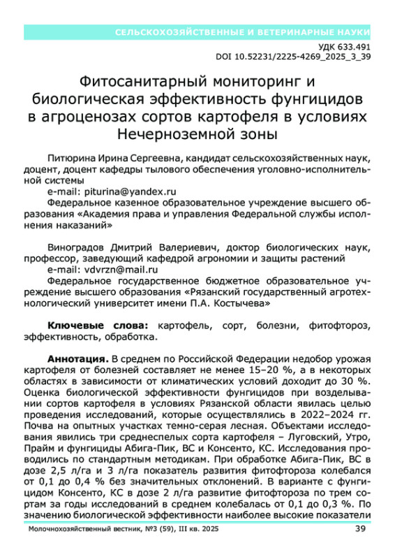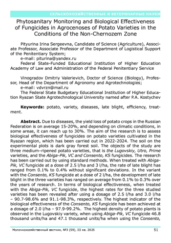 1. Pityurina I. S., Vinogradov D. V., Musaev F. A., Goncharuk D. V. Agro-ecological testing of varieties and qualitative characteristics of potato tubers in the conditions of the Ryazan region.International Scientific and Practical Conference “Improving Energy Efficiency, Environmental Safety and Sustainable Development in Agriculture”. Saratov, 20-24 October 2021. London: IOP Publishing Ltd, 2022. P. 012031. - 10.1088/1755- 1315/979/1/012031. DOI: 10.1088/1755-1315/979/1/012031