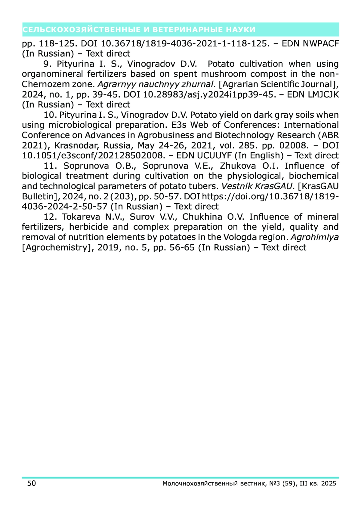 9. Питюрина, И.С. Выращивание картофеля с использованием органоминеральных удобрений на основе отработанного грибного компоста в условиях Нечерноземной зоны / И. С. Питюрина, Д. В. Виноградов // Аграрный научный журнал. - 2024. - № 1. - С. 39-45. -. DOI: 10.28983/asj.y2024i1pp39-45