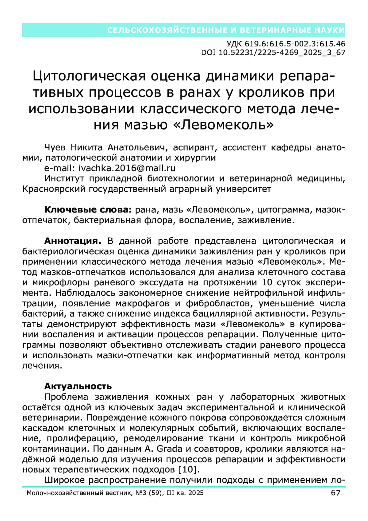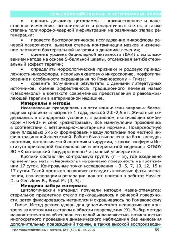 Проблема заживления кожных ран у лабораторных животных остаётся одной из ключевых задач экспериментальной и клинической ветеринарии. Повреждение кожного покрова сопровождается сложным каскадом клеточных и молекулярных событий, включающих воспаление, пролиферацию, ремоделирование ткани и контроль микробной контаминации. По данным A. Grada и соавторов, кролики являются надёжной моделью для изучения процессов репарации и эффективности новых терапевтических подходов [10].