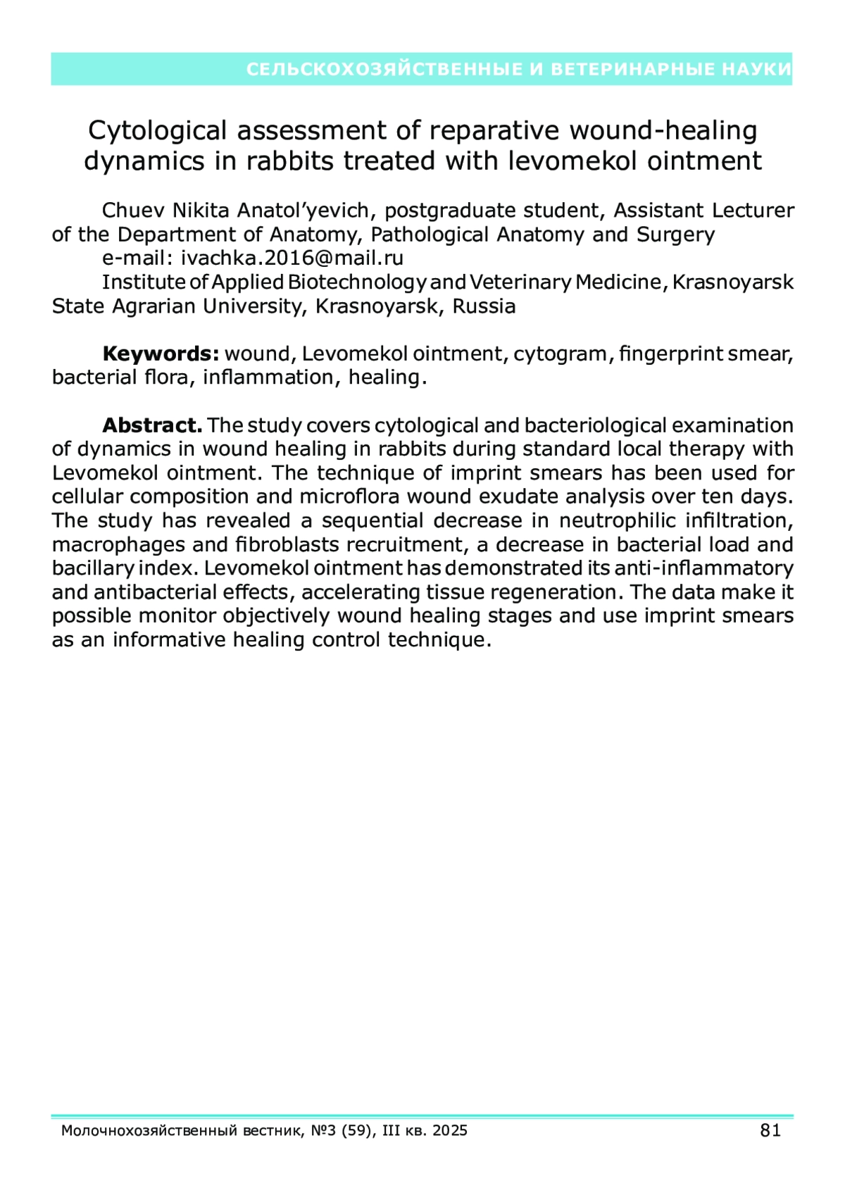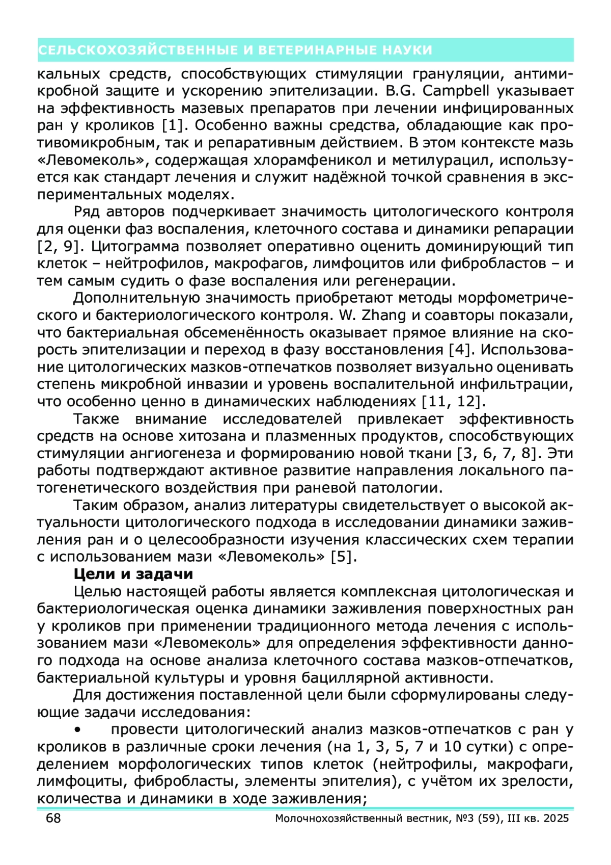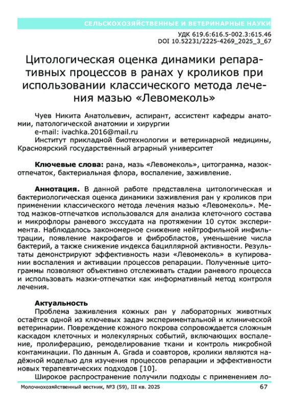 В данной работе представлена цитологическая и бактериологическая оценка динамики заживления ран у кроликов при применении классического метода лечения мазью «Левомеколь». Метод мазков-отпечатков использовался для анализа клеточного состава и микрофлоры раневого экссудата на протяжении 10 суток эксперимента. Наблюдалось закономерное снижение нейтрофильной инфильтрации, появление макрофагов и фибробластов, уменьшение числа бактерий, а также снижение индекса бациллярной активности. Результаты демонстрируют эффективность мази «Левомеколь» в купировании воспаления и активации процессов репарации. Полученные цитограммы позволяют объективно отслеживать стадии раневого процесса и использовать мазки-отпечатки как информативный метод контроля лечения.