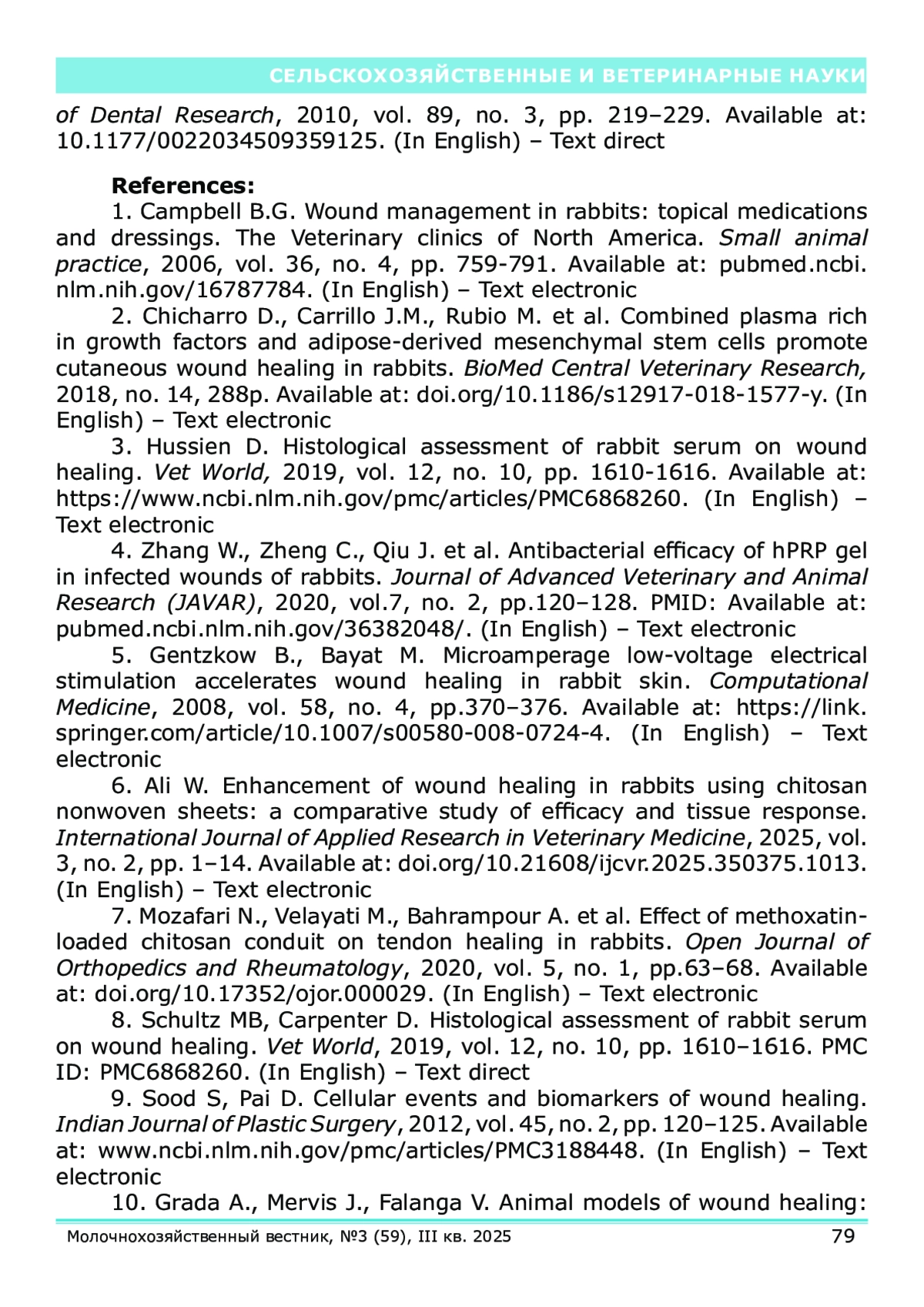 3. Hussien D. Histological assessment of rabbit serum on wound healing. Vet World, 2019, vol. 12, no. 10, pp. 1610-1616. Available at: https://www.ncbi.nlm.nih.gov/pmc/articles/PMC6868260. (In English) - Text electronic.