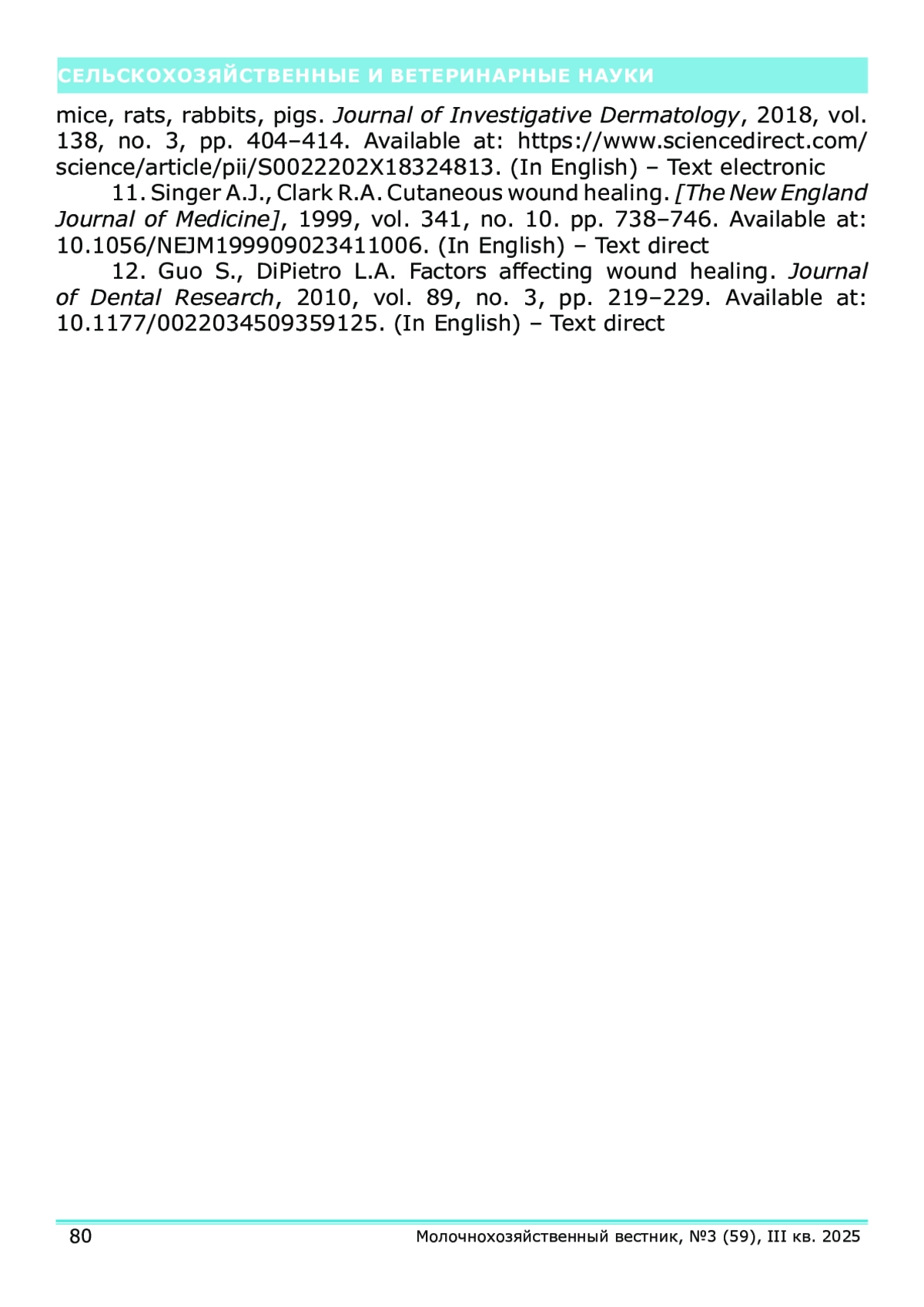 10. Grada A., Mervis J., Falanga V. Animal models of wound healing: mice, rats, rabbits, pigs. Journal of Investigative Dermatology, 2018, vol. 138, no. 3, pp. 404-414. Available at: https://www.sciencedirect.com/science/article/pii/S0022202X18324813. (In English) - Text electronic.