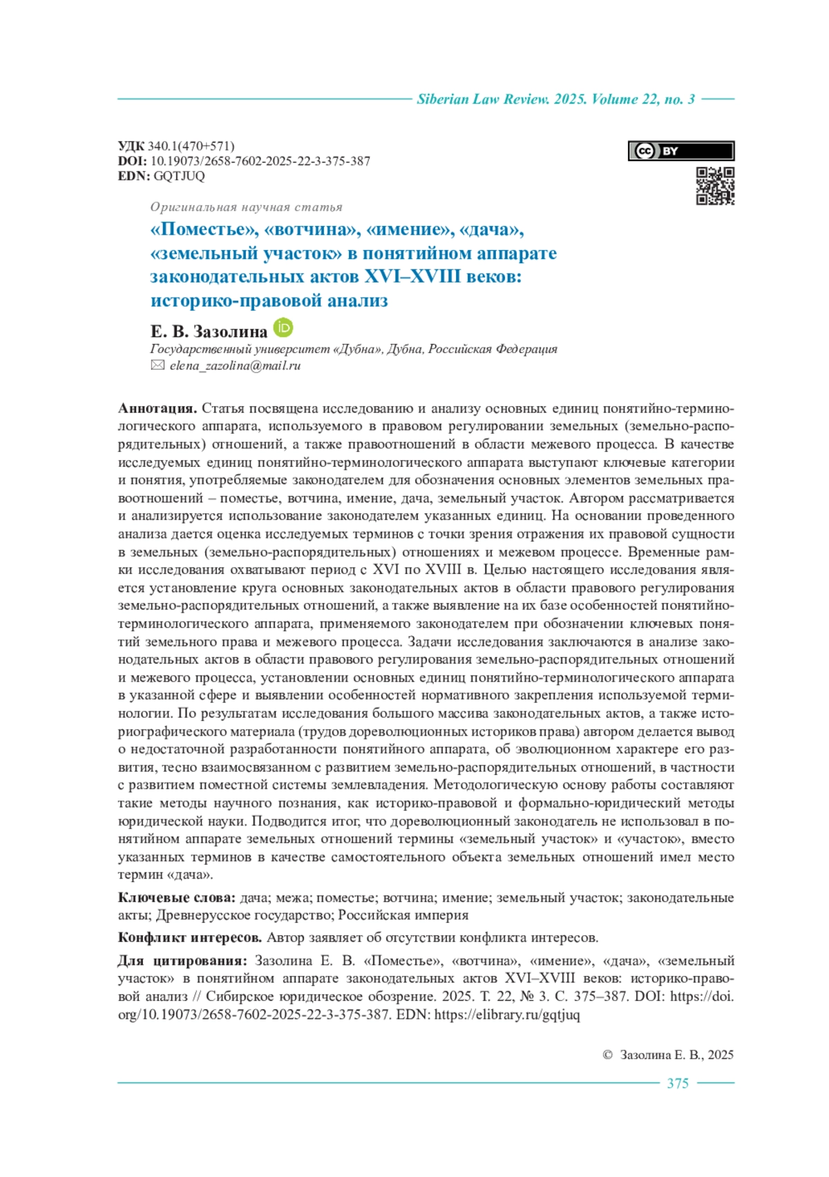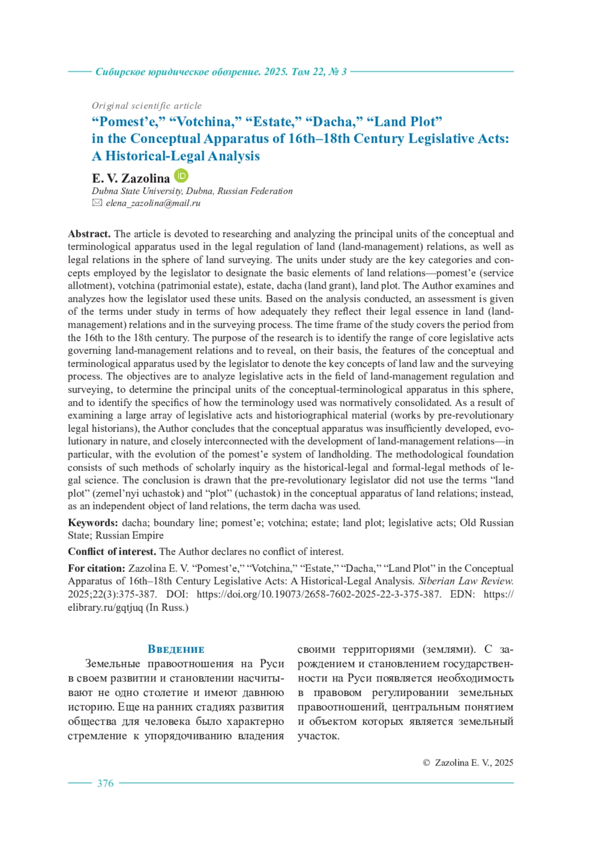 Статья посвящена исследованию и анализу основных единиц понятийно-терминологического аппарата, используемого в правовом регулировании земельных (земельно-распорядительных) отношений, а также правоотношений в области межевого процесса. В качестве исследуемых единиц понятийно-терминологического аппарата выступают ключевые категории и понятия, употребляемые законодателем для обозначения основных элементов земельных правоотношений – поместье, вотчина, имение, дача, земельный участок. Автором рассматривается и анализируется использование законодателем указанных единиц. На основании проведенного анализа дается оценка исследуемых терминов с точки зрения отражения их правовой сущности в земельных (земельно-распорядительных) отношениях и межевом процессе. Временные рамки исследования охватывают период с XVI по XVIII в. Целью настоящего исследования является установление круга основных законодательных актов в области правового регулирования земельно-распорядительных отношений, а также выявление на их базе особенностей понятийно-терминологического аппарата, применяемого законодателем при обозначении ключевых понятий земельного права и межевого процесса. Задачи исследования заключаются в анализе законодательных актов в области правового регулирования земельно-распорядительных отношений и межевого процесса, установлении основных единиц понятийно-терминологического аппарата в указанной сфере и выявлении особенностей нормативного закрепления используемой терминологии. По результатам исследования большого массива законодательных актов, а также историографического материала (трудов дореволюционных историков права) автором делается вывод о недостаточной разработанности понятийного аппарата, об эволюционном характере его развития, тесно взаимосвязанном с развитием земельно-распорядительных отношений, в частности с развитием поместной системы землевладения. Методологическую основу работы составляют такие методы научного познания, как историко-правовой и формально-юридический методы юридической науки. Подводится итог, что дореволюционный законодатель не использовал в понятийном аппарате земельных отношений термины «земельный участок» и «участок», вместо указанных терминов в качестве самостоятельного объекта земельных отношений имел место термин «дача».