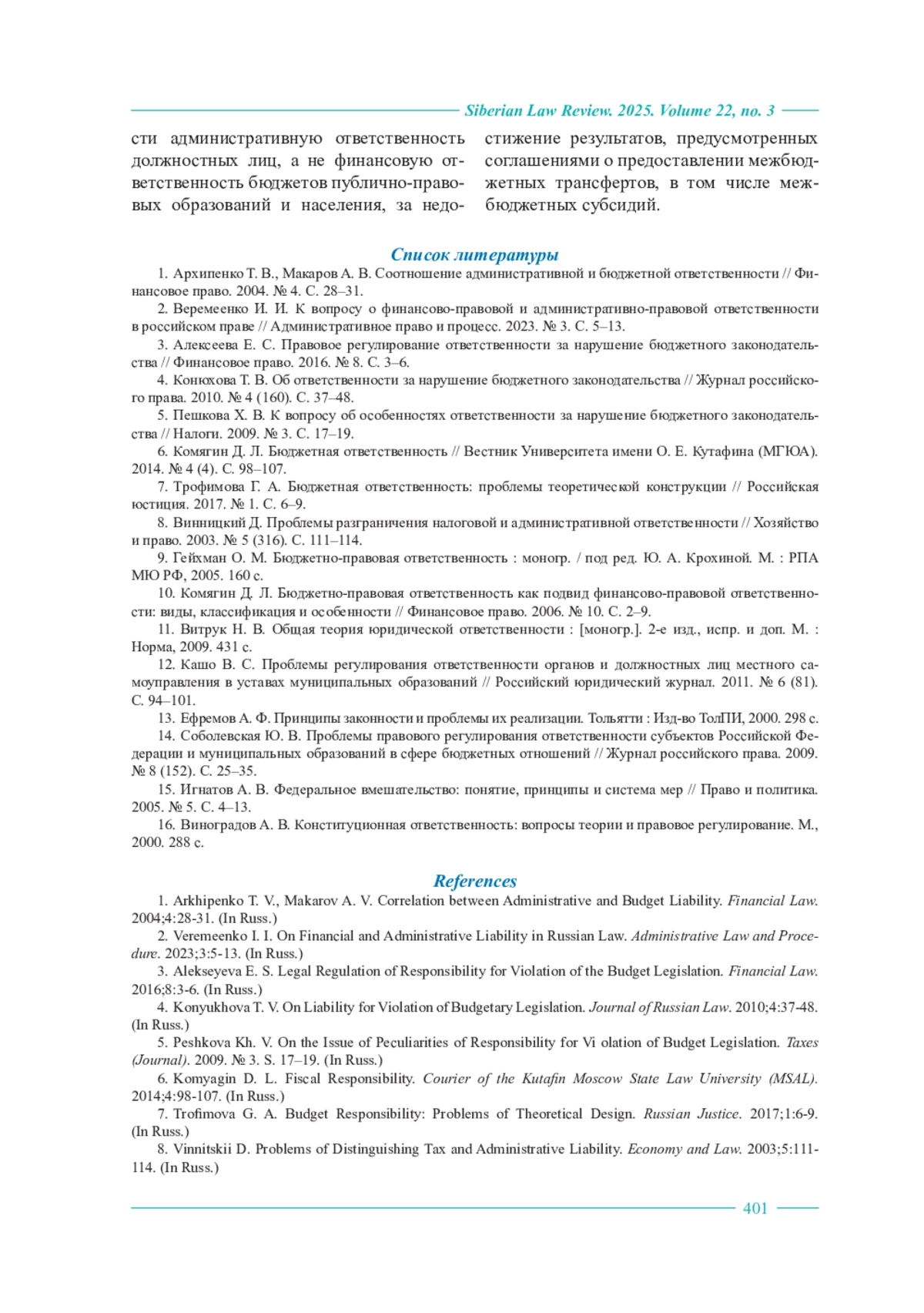 1. Архипенко Т. В., Макаров А. В. Соотношение административной и бюджетной ответственности // Финансовое право. 2004. № 4. С. 28-31.