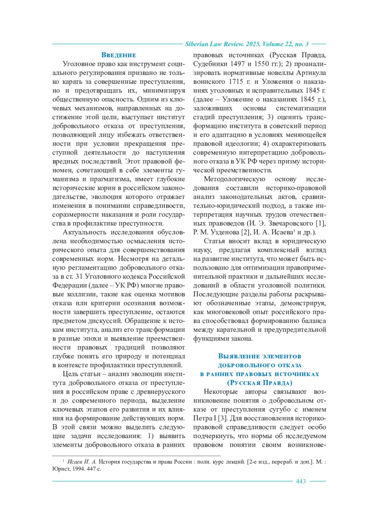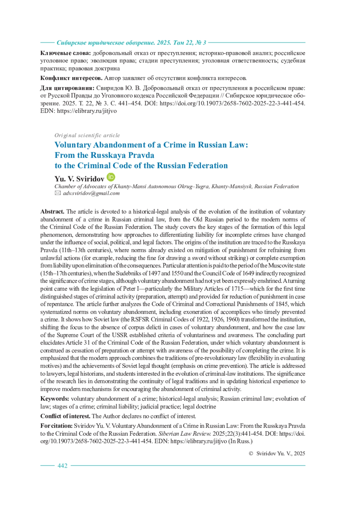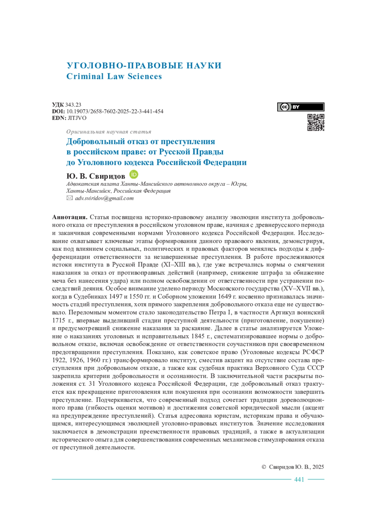 СВИРИДОВ Ю. В. ДОБРОВОЛЬНЫЙ ОТКАЗ ОТ ПРЕСТУПЛЕНИЯ В РОССИЙСКОМ ПРАВЕ: ОТ РУССКОЙ ПРАВДЫ ДО УГОЛОВНОГО КОДЕКСА РОССИЙСКОЙ ФЕДЕРАЦИИ // СИБИРСКОЕ ЮРИДИЧЕСКОЕ ОБОЗРЕНИЕ. 2025. ТОМ 22, №3