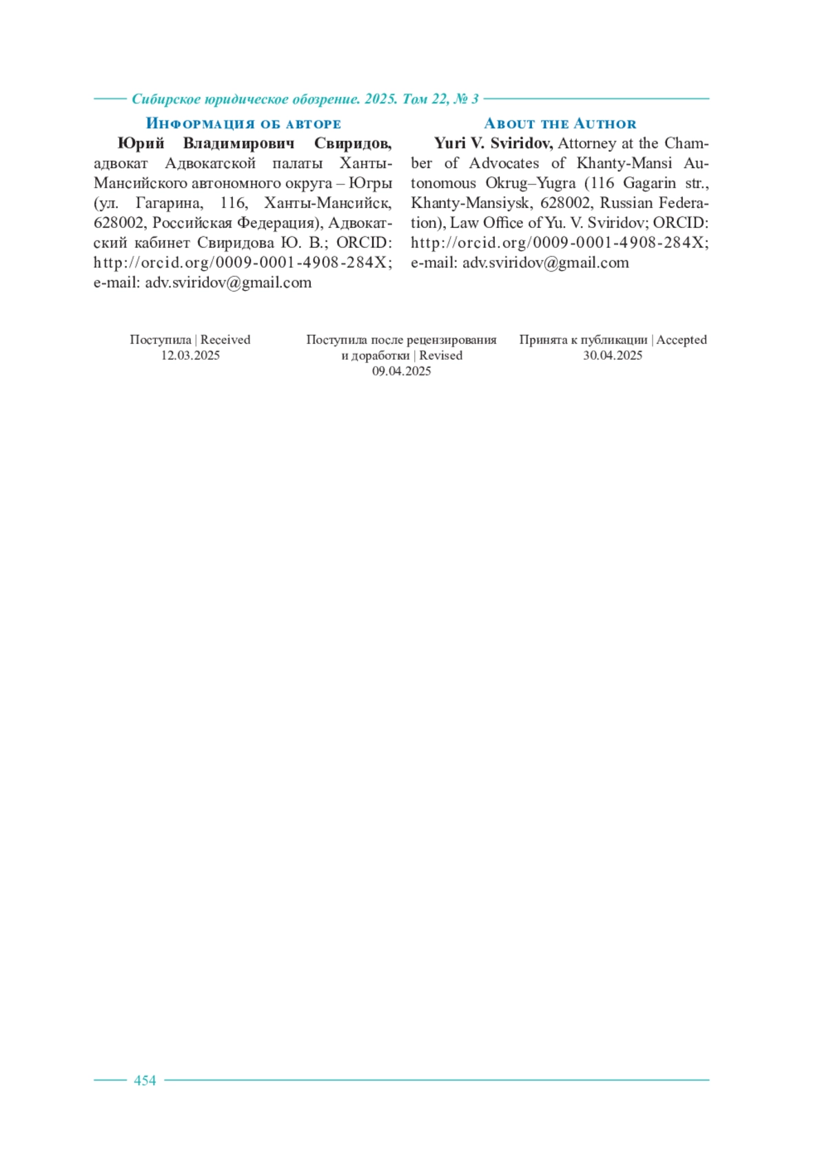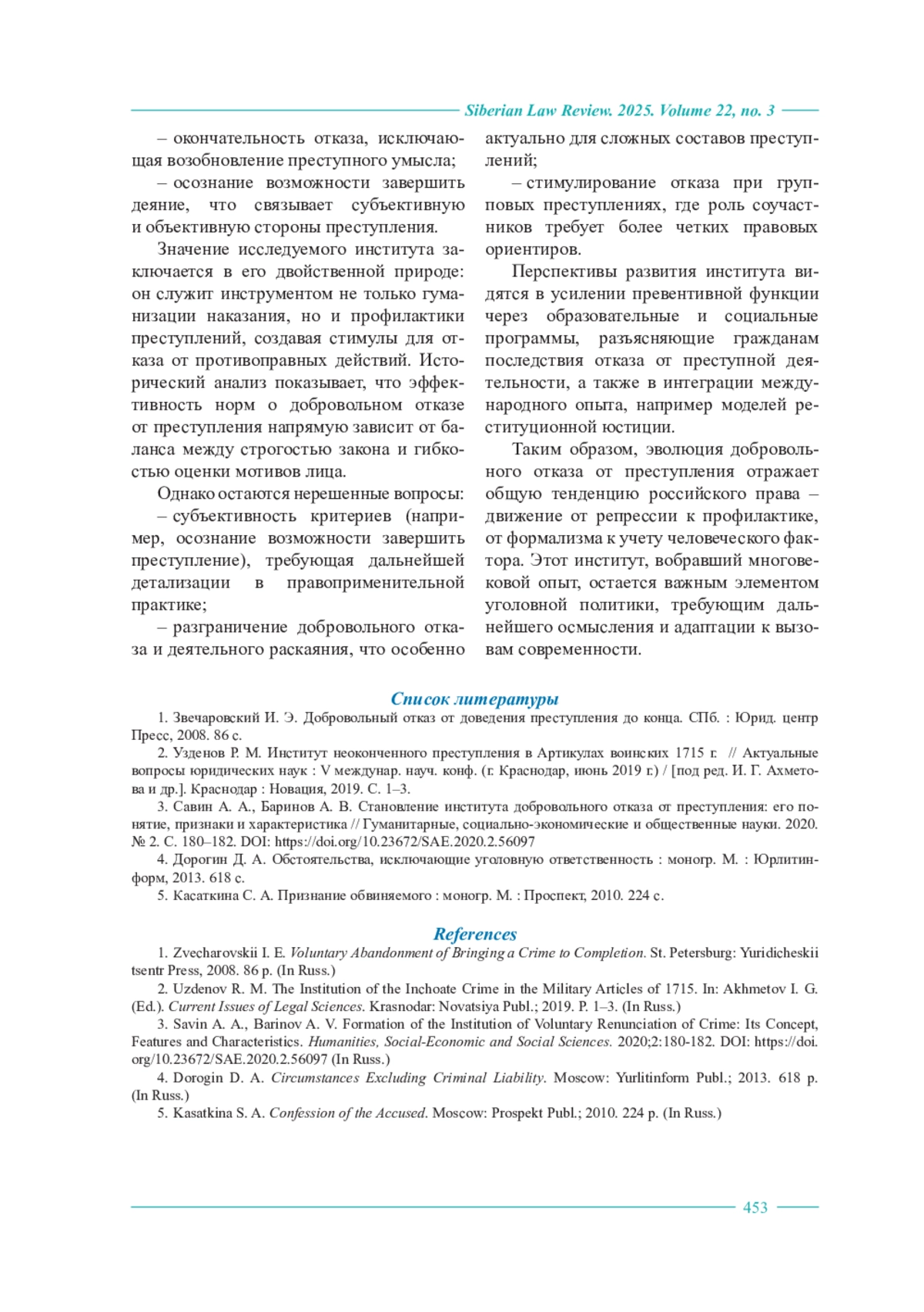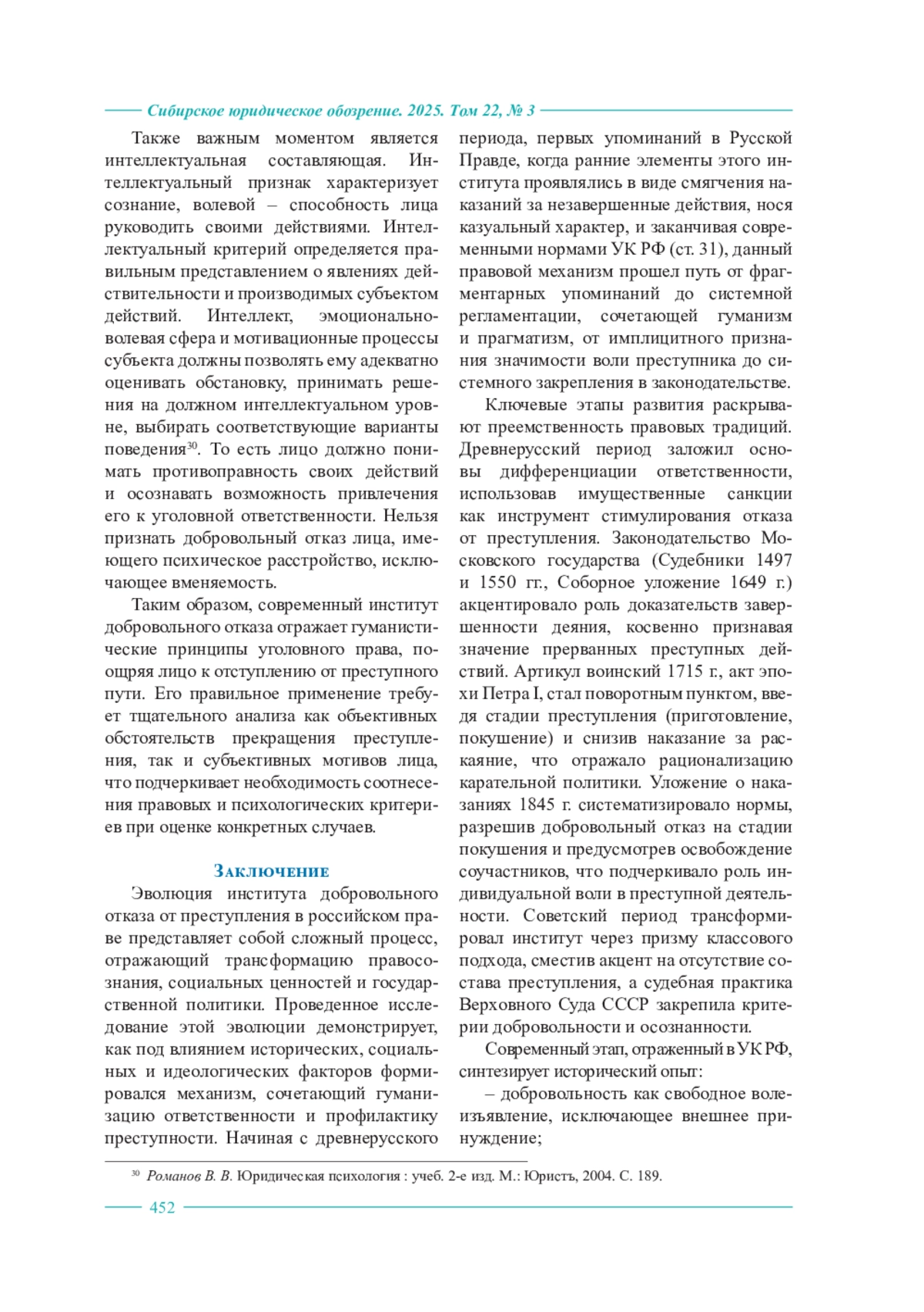 СВИРИДОВ Ю. В. ДОБРОВОЛЬНЫЙ ОТКАЗ ОТ ПРЕСТУПЛЕНИЯ В РОССИЙСКОМ ПРАВЕ: ОТ РУССКОЙ ПРАВДЫ ДО УГОЛОВНОГО КОДЕКСА РОССИЙСКОЙ ФЕДЕРАЦИИ // СИБИРСКОЕ ЮРИДИЧЕСКОЕ ОБОЗРЕНИЕ. 2025. ТОМ 22, №3