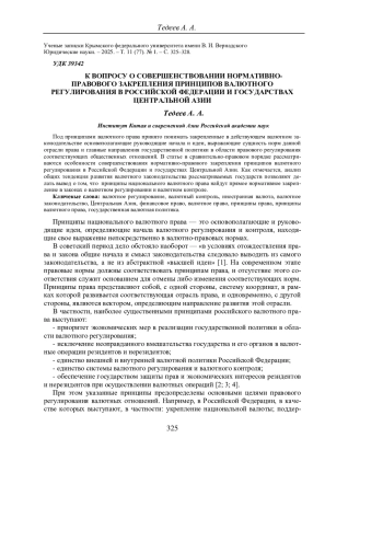 Под принципами валютного права принято понимать закрепленные в действующем валютном законодательстве основополагающие руководящие начала и идеи, выражающие сущность норм данной отрасли права и главные направления государственной политики в области правового регулирования соответствующих общественных отношений. В статье в сравнительно-правовом порядке рассматриваются особенности совершенствования нормативно-правового закрепления принципов валютного регулирования в Российской Федерации и государствах Центральной Азии. Как отмечается, анализ общих тенденция развития валютного законодательства рассматриваемых государств позволяют делать вывод о том, что принципы национального валютного права найдут прямое нормативное закрепление в законах о валютном регулировании и валютном контроле.