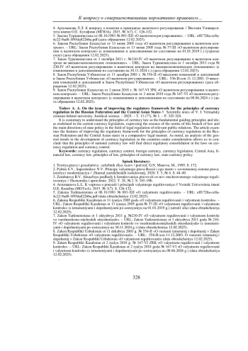 3. Зембатова Б.В. Актуальные подходы к формированию правовых основ отечественного валютного регулирования // Экономика и управление. 2022. Т. 28, № 2. С. 185-196. EDN: AJKOXF