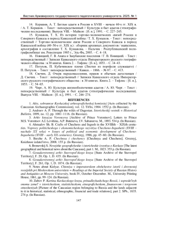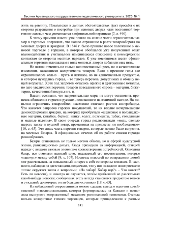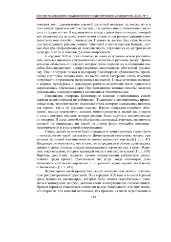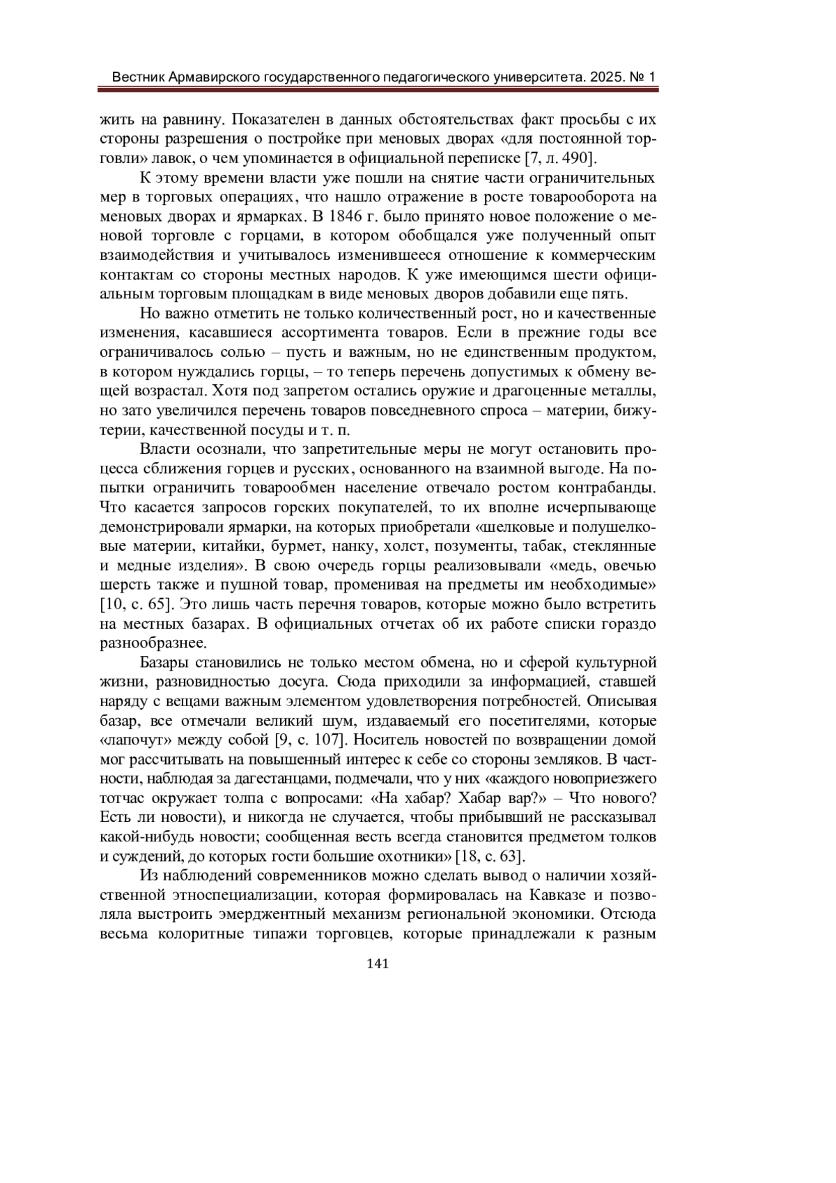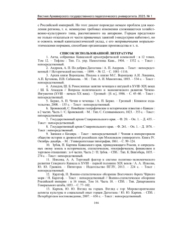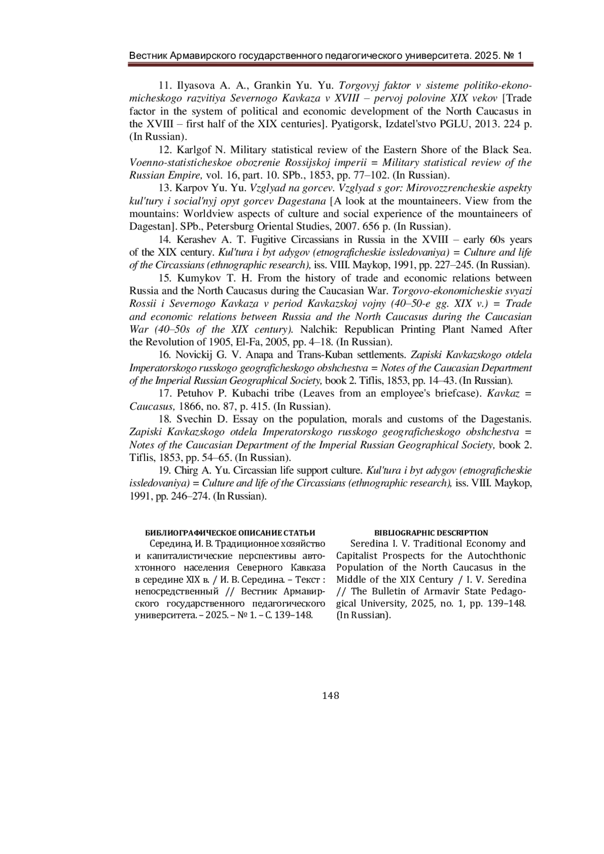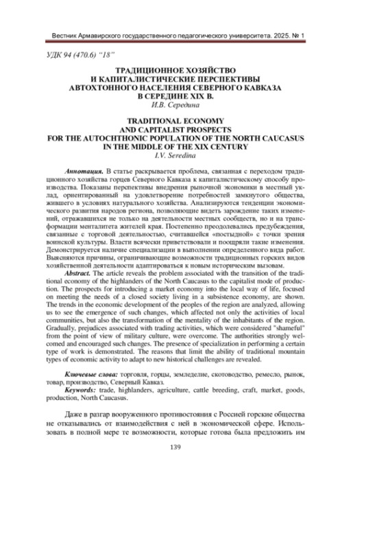 СЕРЕДИНА И. В. ТРАДИЦИОННОЕ ХОЗЯЙСТВО И КАПИТАЛИСТИЧЕСКИЕ ПЕРСПЕКТИВЫ АВТОХТОННОГО НАСЕЛЕНИЯ СЕВЕРНОГО КАВКАЗА В СЕРЕДИНЕ XIX В. // ВЕСТНИК АРМАВИРСКОГО ГОСУДАРСТВЕННОГО ПЕДАГОГИЧЕСКОГО УНИВЕРСИТЕТА. 2025. № 1