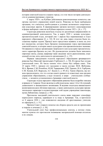 Статья посвящена истории деятельности отдела народного образования Армавирского революционного комитета с момента установления в городе советской власти в марте 1920 г. и в течение примерно первого года ее существования. В статье рассмотрены организационные мероприятия ревкома, направленные на создание системы народного образования и просвещения в Армавире, налаживание работы с учительским составом города, меры по ликвидации безграмотности, в том числе организация школ грамотности, пунктов ликбеза, элементы программы обучения безграмотных. Отдельно в статье уделено внимание мероприятиям по организации дошкольного воспитания. Уже в первый же год своего существования в Армавире советская власть в лице своих местных органов занялась и социально проблемными категориями детей и подростков, в том числе детьми с ограниченными возможностями здоровья и несовершеннолетними преступниками. В Армавире были организованы детские приюты, детские трудовые колонии, детские площадки.