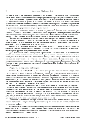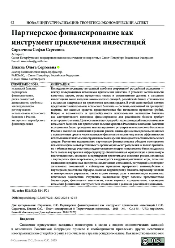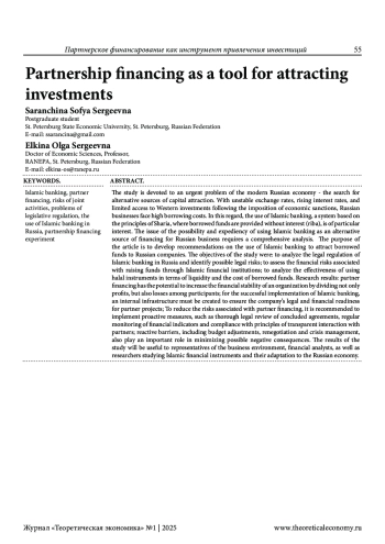 Большинство экспертов сходятся в мысли, что исламский банкинг имеет потенциал для развития в России, но сталкивается с рядом препятствий, таких как отсутствие законодательной базы, недостаток специалистов и непонимание модели исламского финансирования. Внедрение исламского банкинга требует создания новых финансовых продуктов и адаптации к местным условиям. Предметом исследования является партнерское финансирование в рамках исламского банкинга как инструмент привлечения заемных средств в российский бизнес. Исследование направлено на анализ правовых и экономических аспектов применения исламских финансовых инструментов в сравнении с традиционными методами кредитования. Объектом исследования выступают российские компании, рассматривающие исламский банкинг в качестве альтернативного источника капитала, а также законодательная и финансовая системы, регулирующие его функционирование в России.