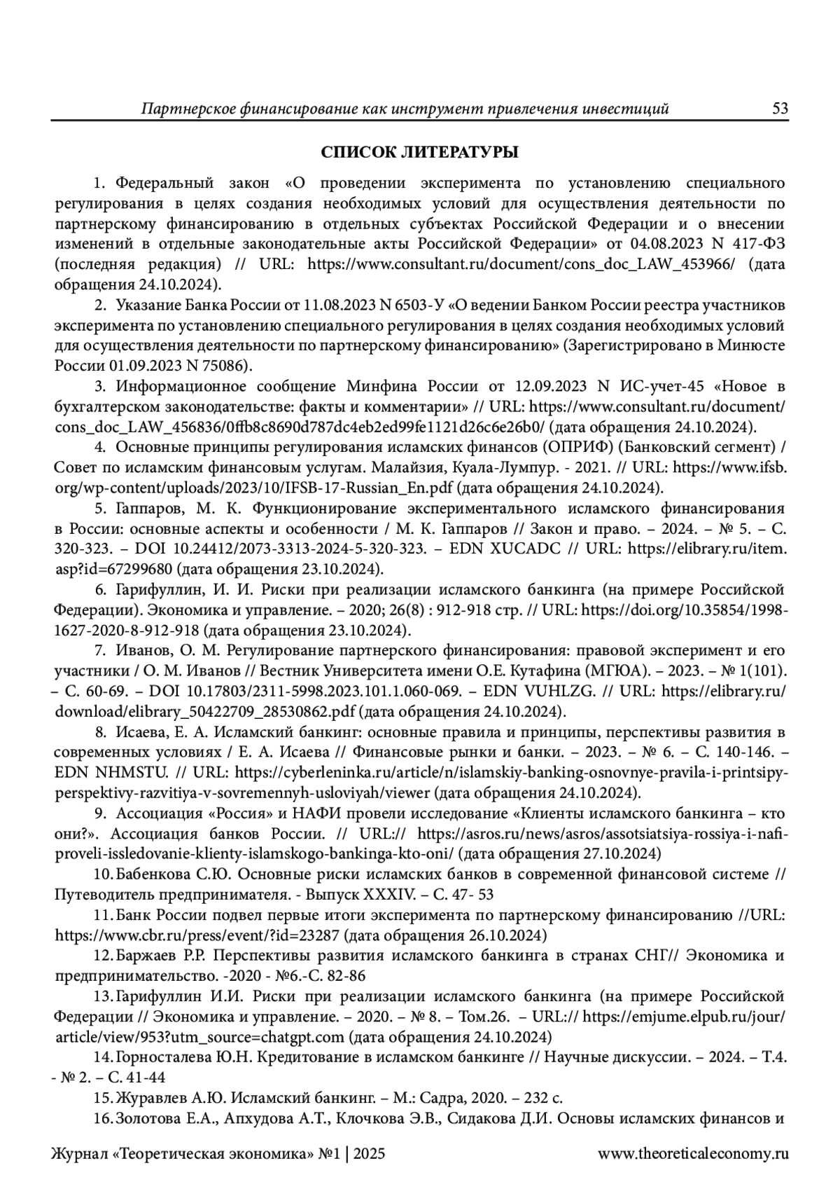13. Гарифуллин И.И. Риски при реализации исламского банкинга (на примере Российской Федерации // Экономика и управление. - 2020. - № 8. - Том.26. - URL:// https://emjume.elpub.ru/jour/article/view/953?utm_source=chatgpt.com (дата обращения 24.10.2024).