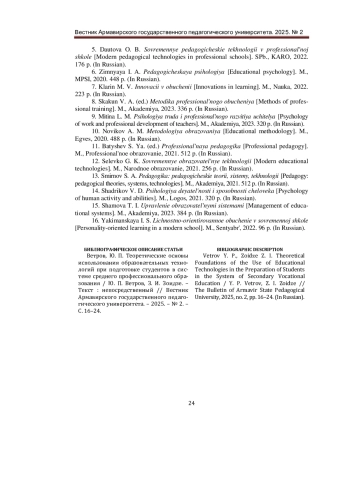 4. Гузеев, В. В. Планирование результатов образования и образовательная технология / В. В. Гузеев. - М.: Народное образование, 2020. - 240 с. - Текст: непосредственный.